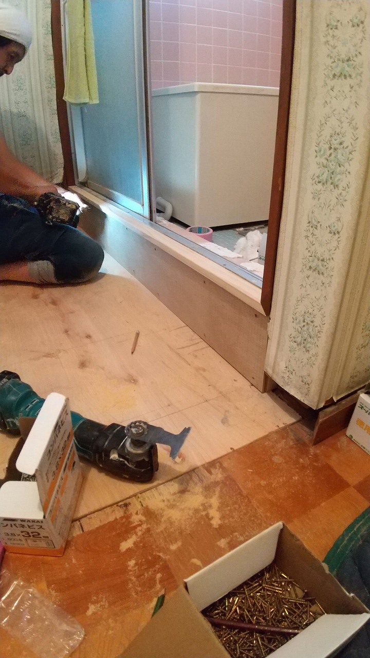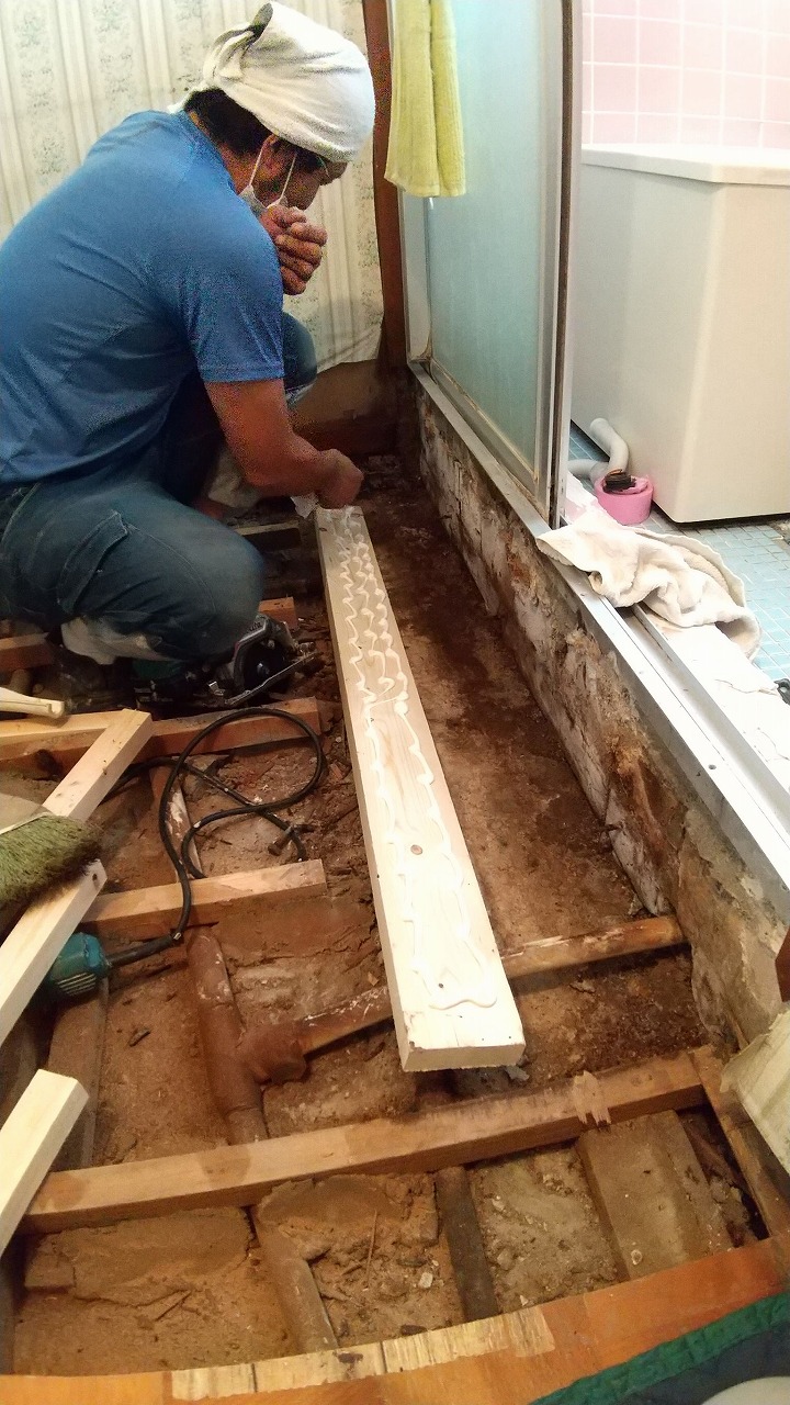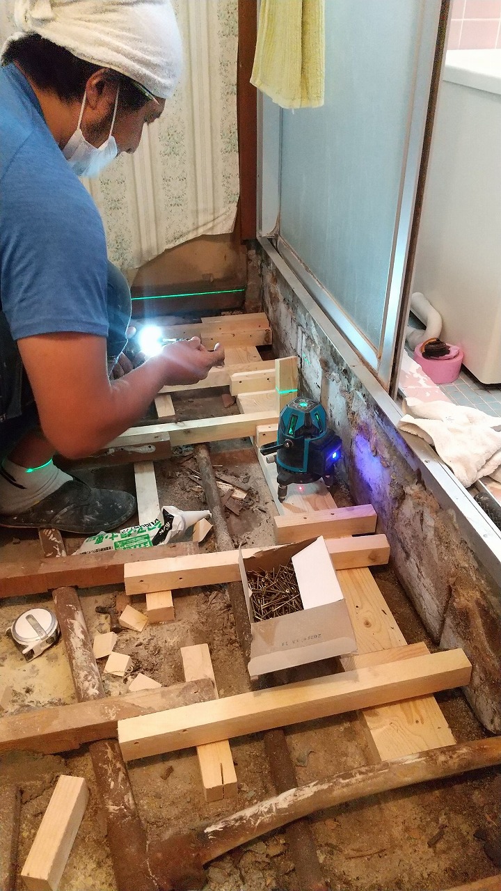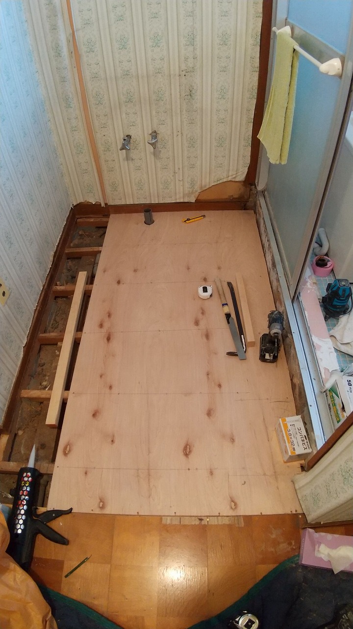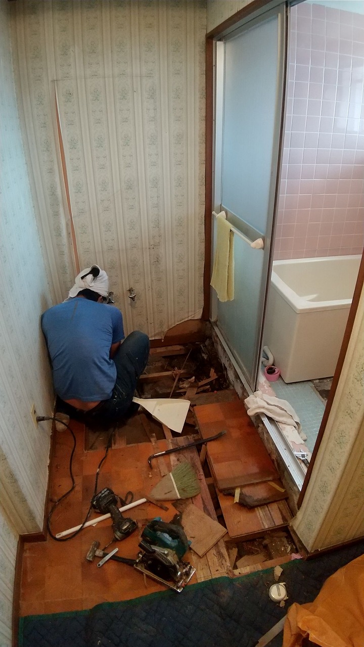 ここの床がかなり腐ってしまっているので、解体して下地を組んで合板ベニアを貼っていきます。