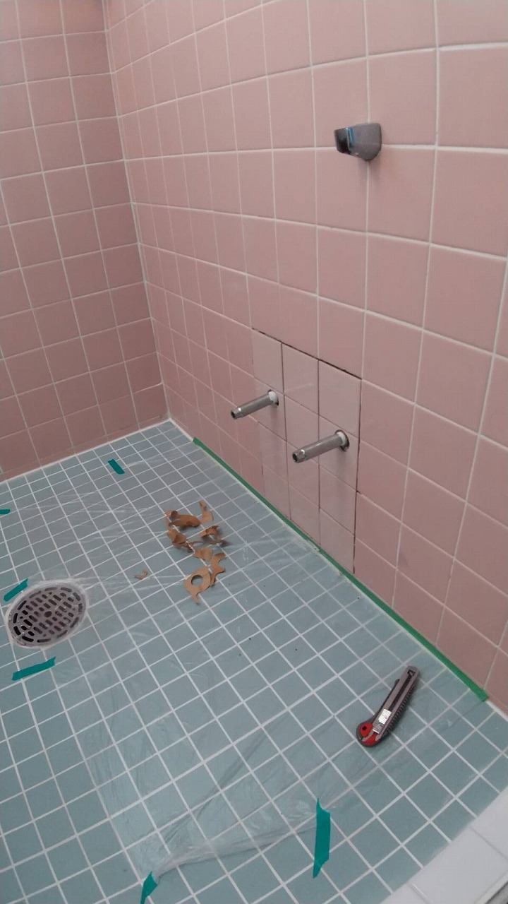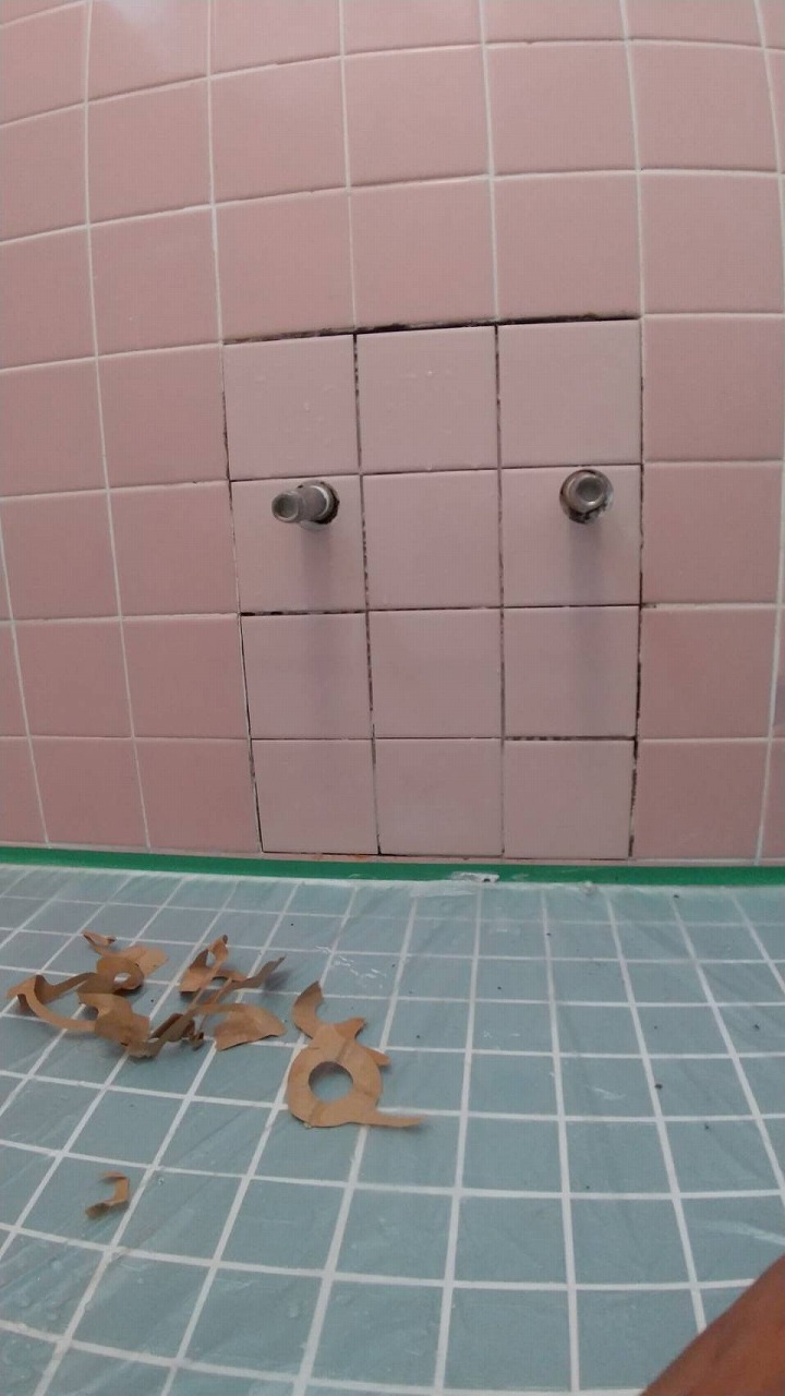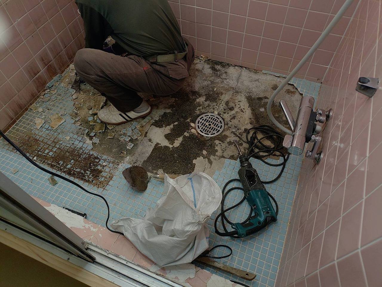 浴槽を一時移動して、床のタイルがボロボロなので、すべてはがします。