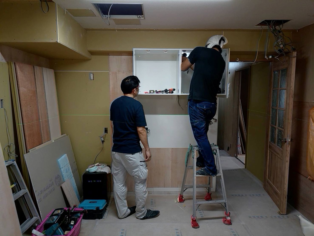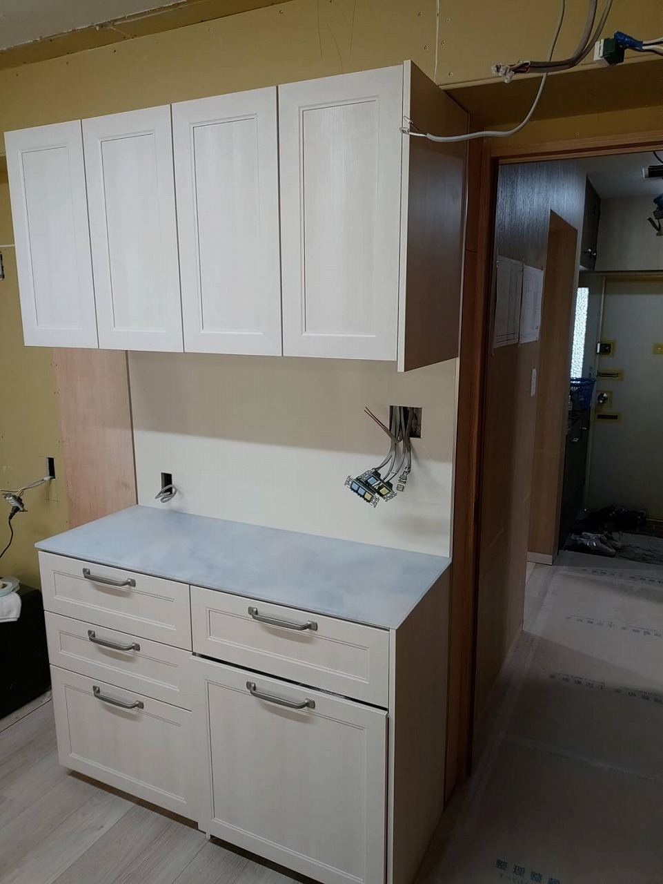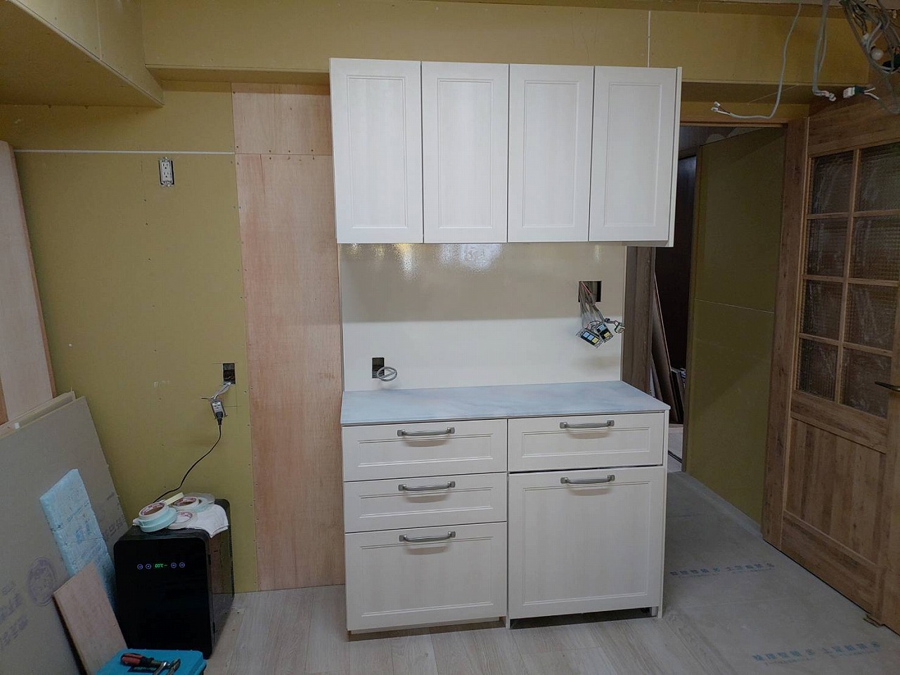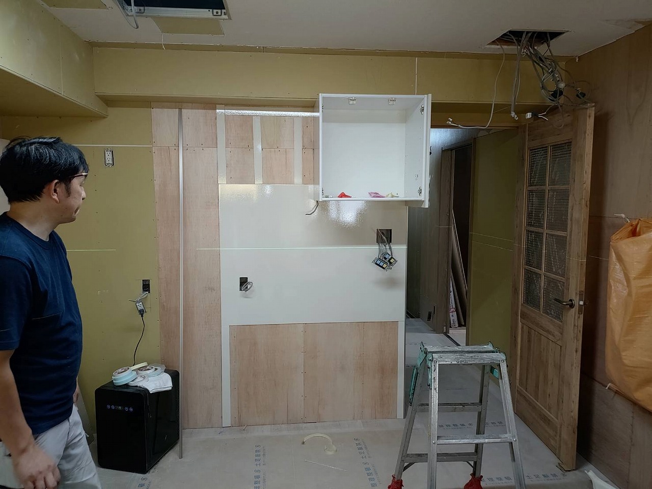 壁にキッチンパネルを貼って、カップボードを設置‼