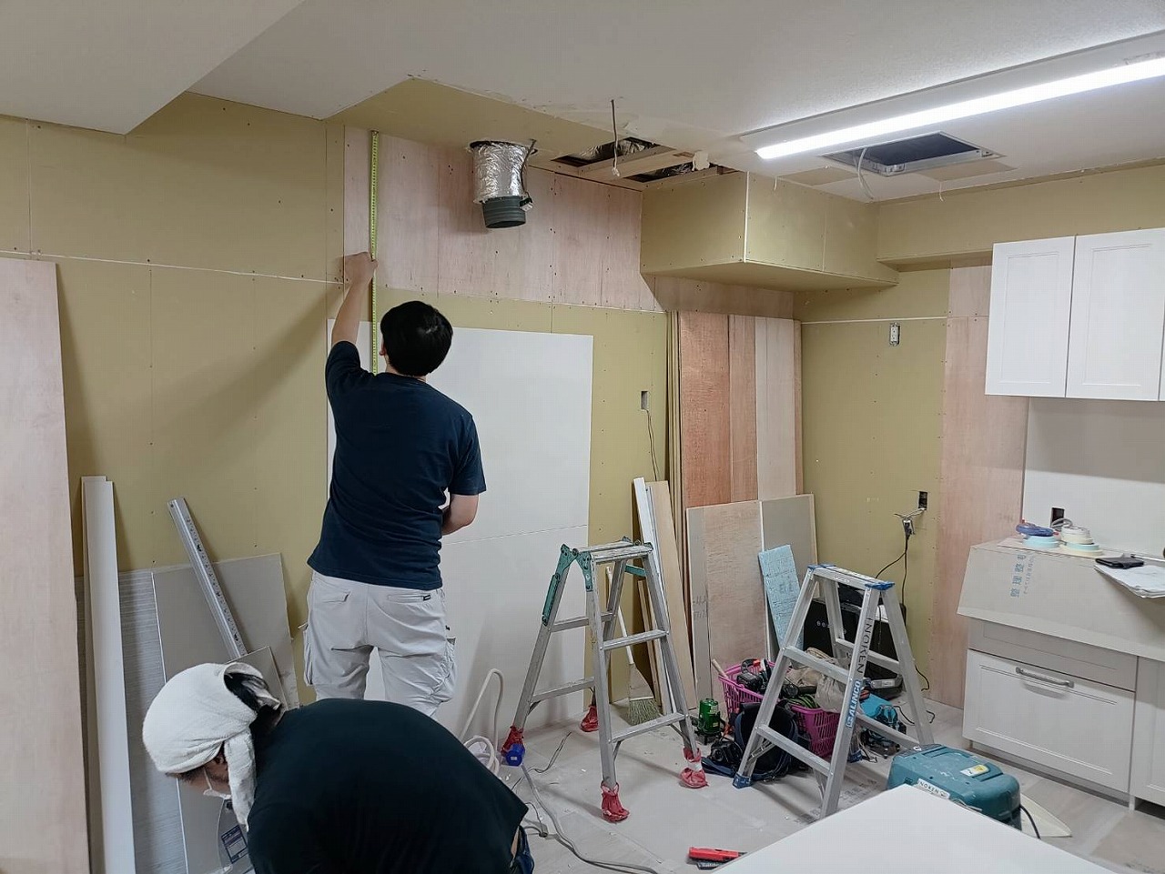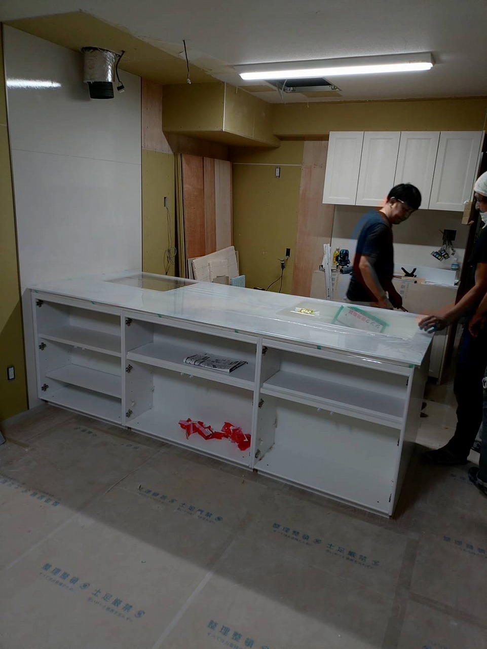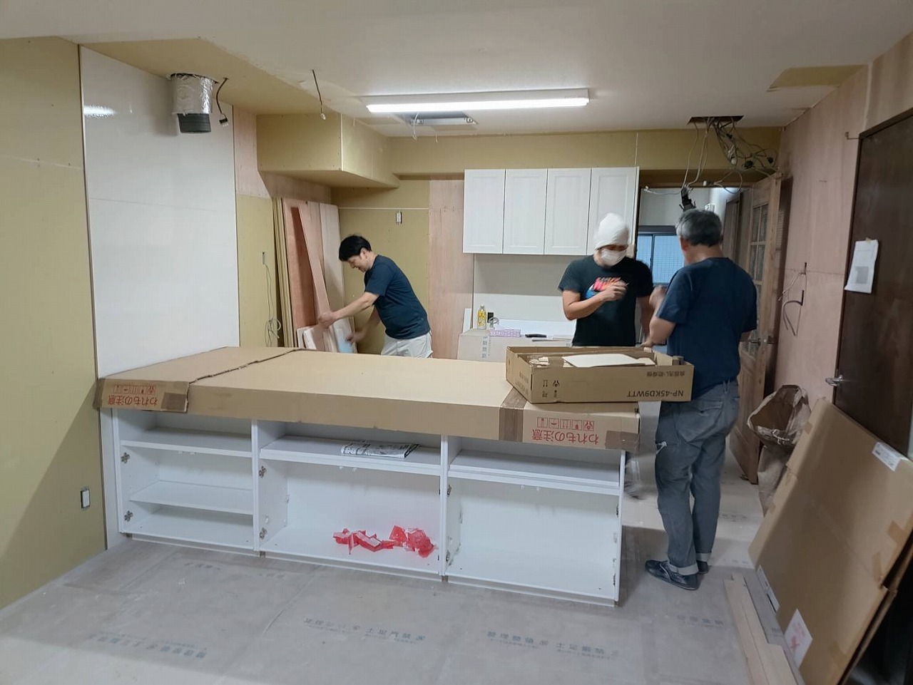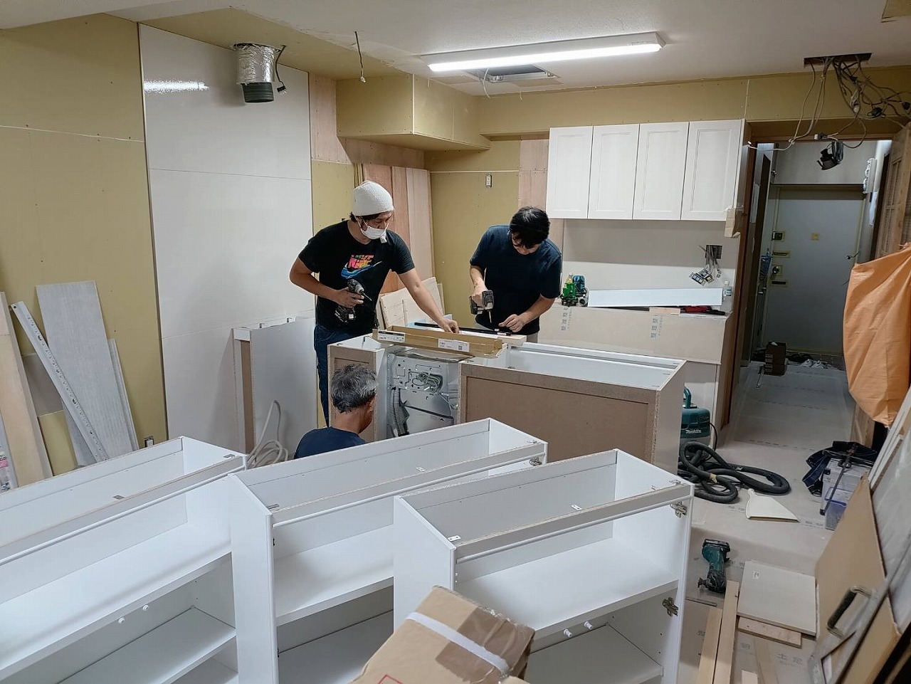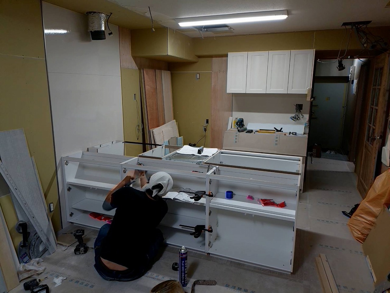 キッチンパネルを壁に設置。キッチン本体を組んでいきます。