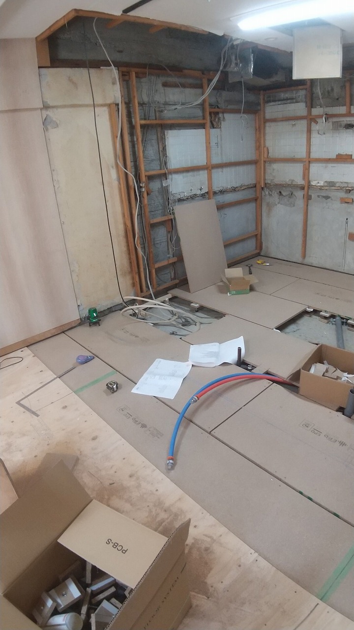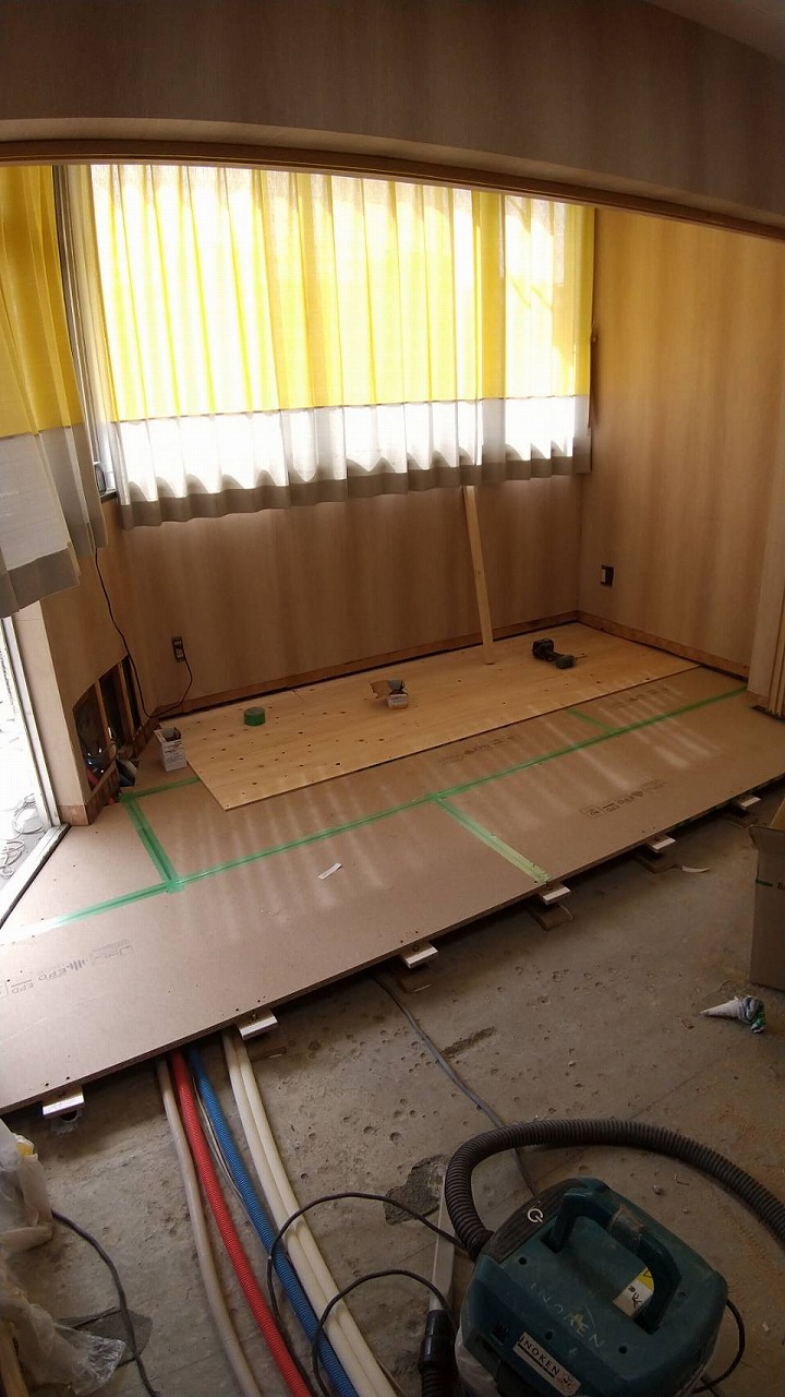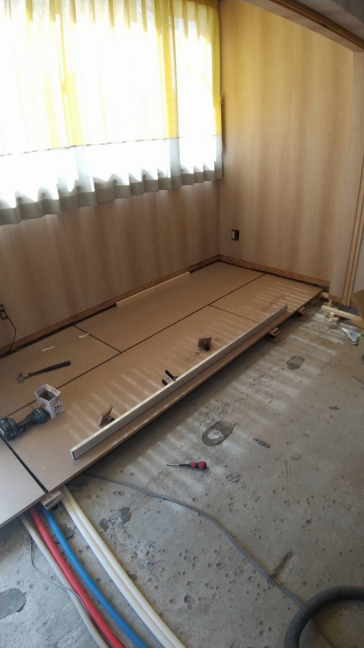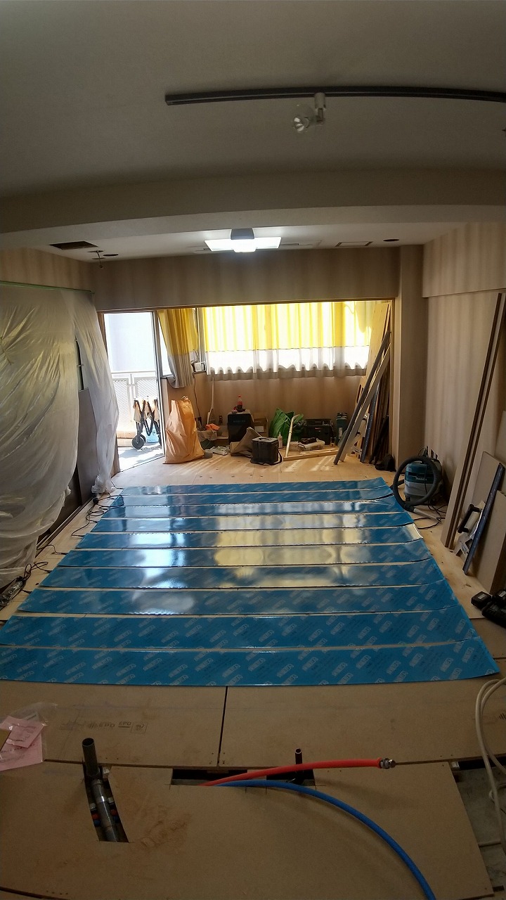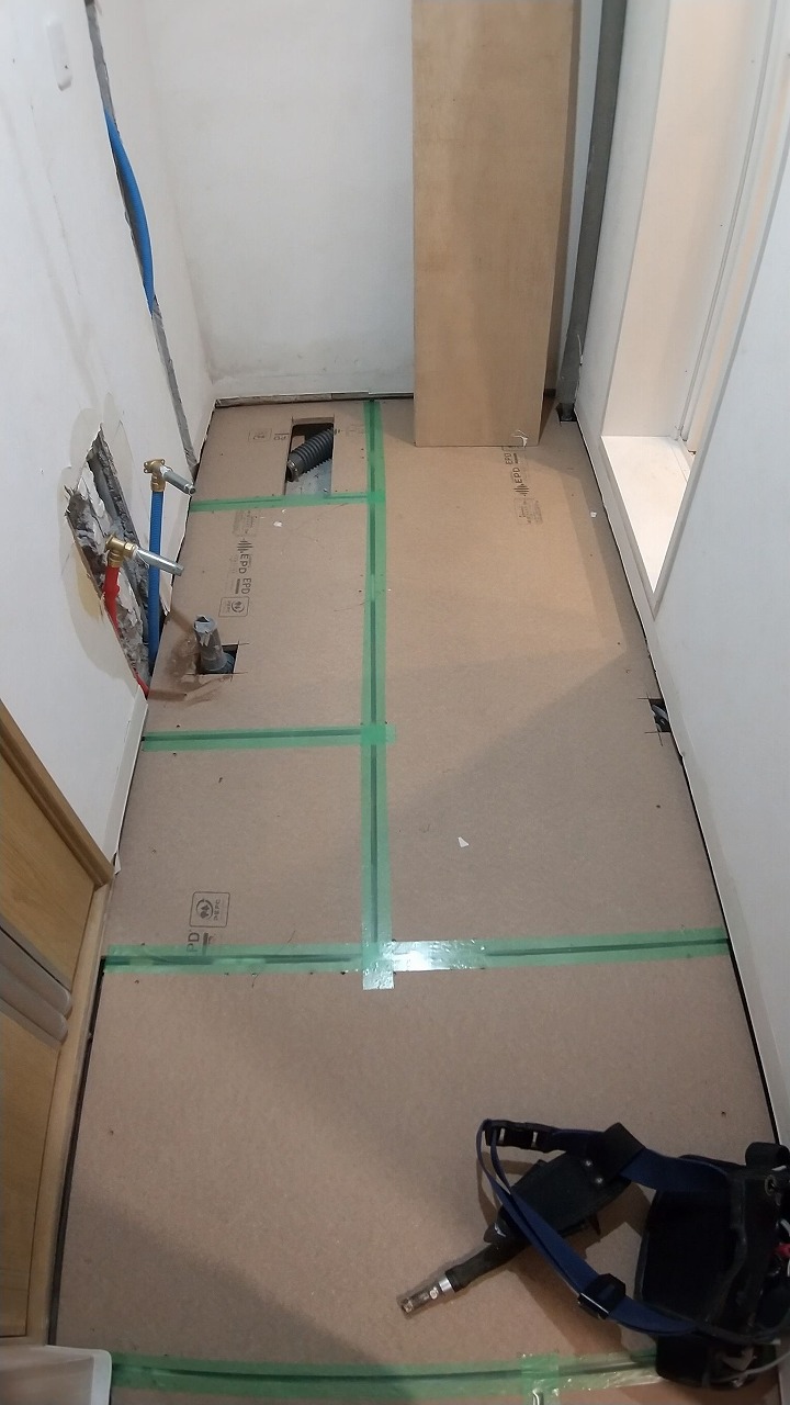 キッチンの配管を出し、床暖シートを設置して、床を貼っていきます。貼り終わったところから養生ボードを‼