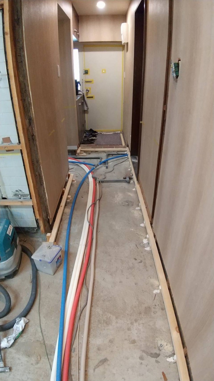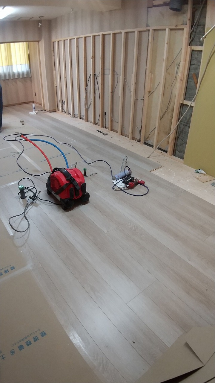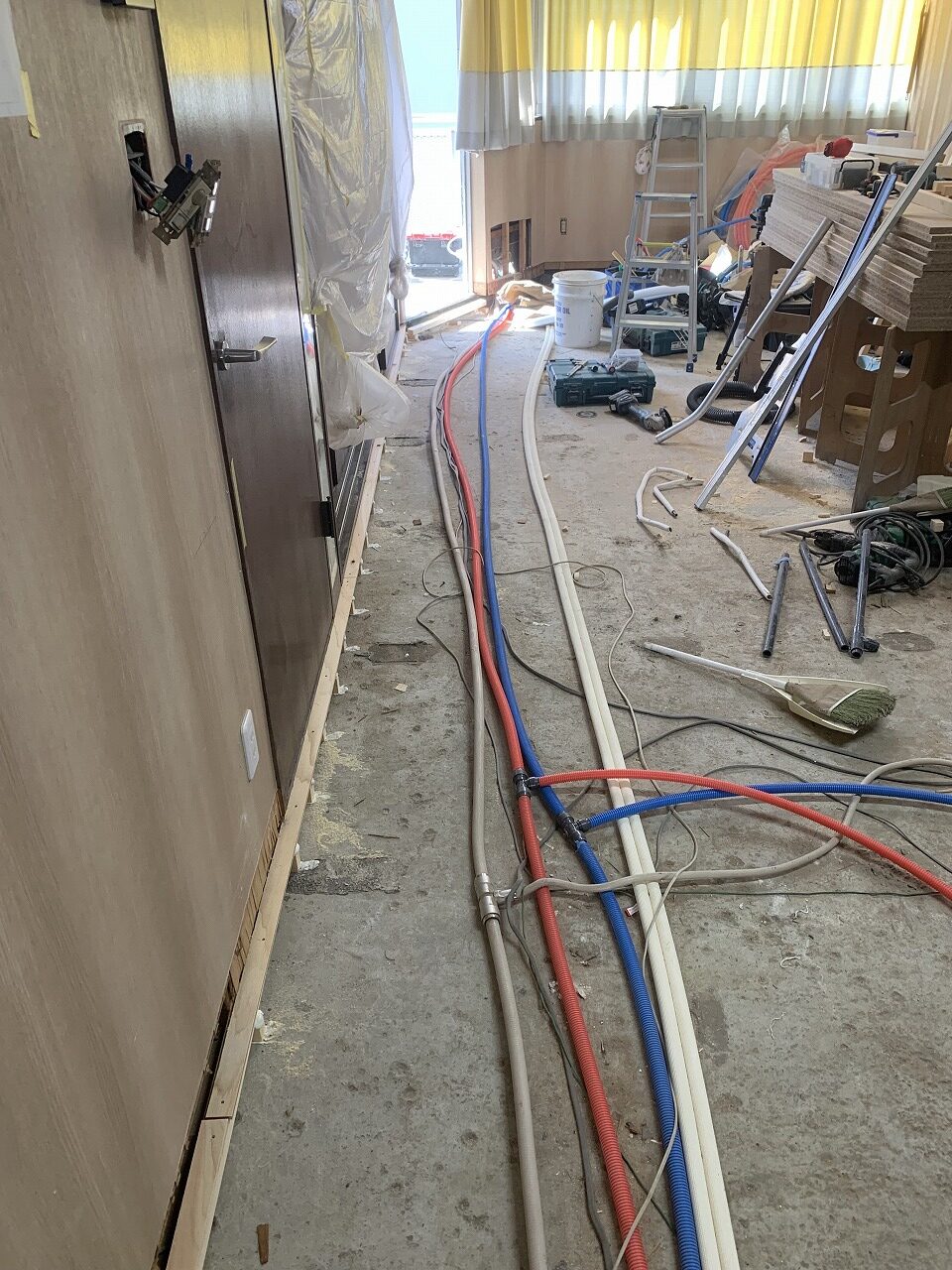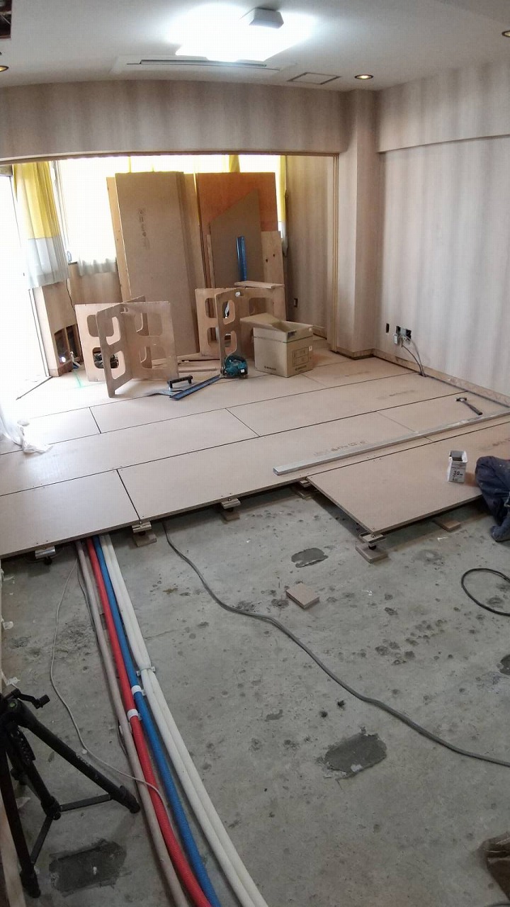 キッチンの配管を出し、床暖シートを設置して、床を貼っていきます。貼り終わったところから養生ボードを‼