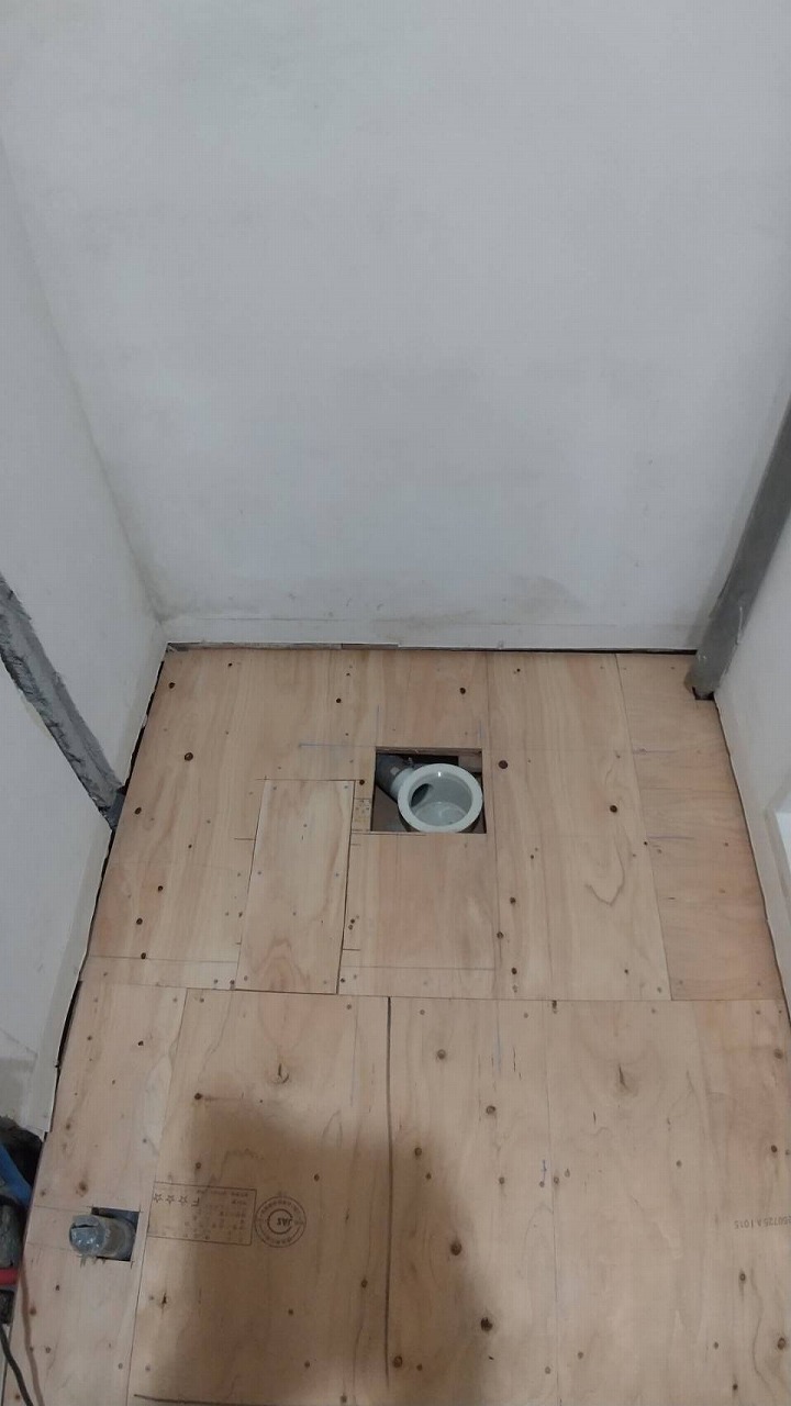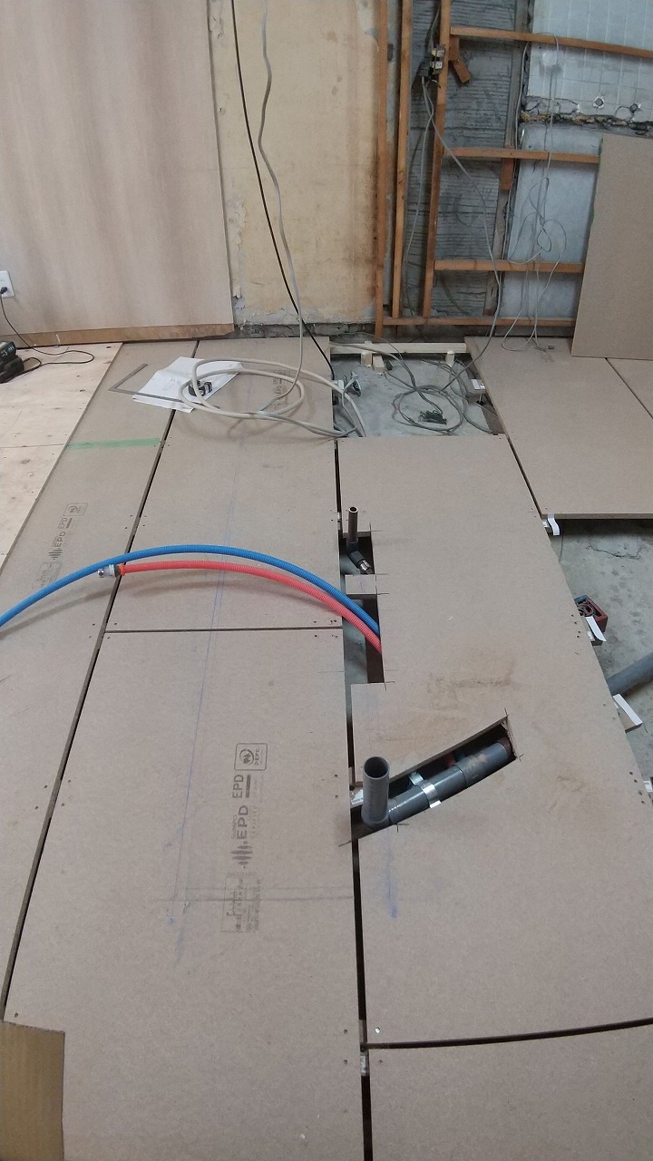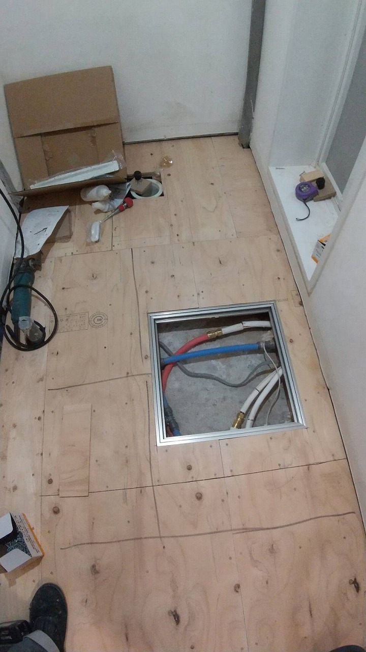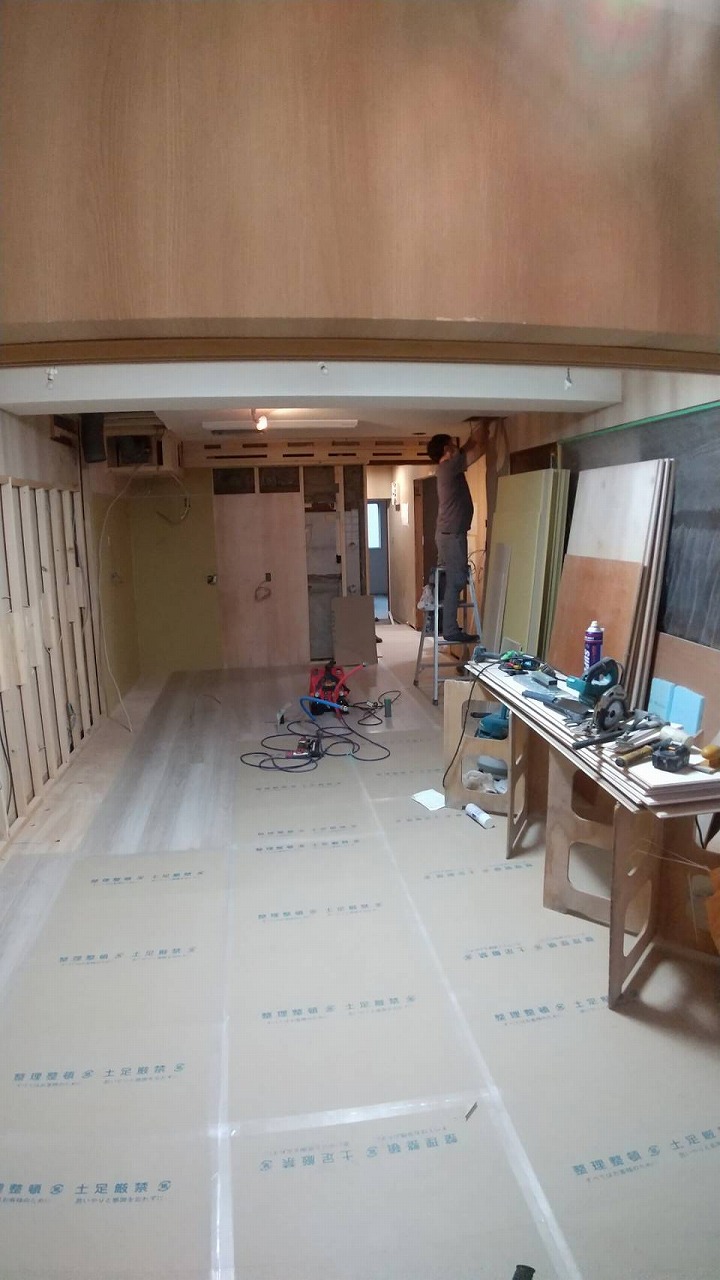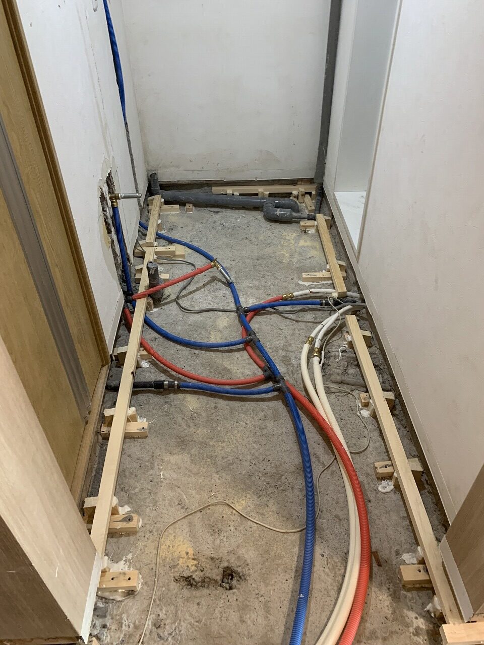 キッチンの配管を出し、床暖シートを設置して、床を貼っていきます。貼り終わったところから養生ボードを‼