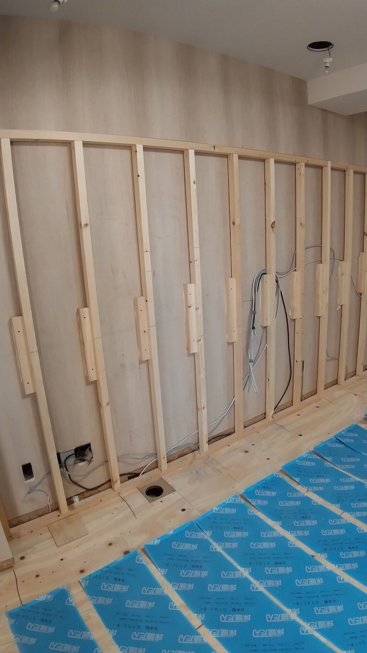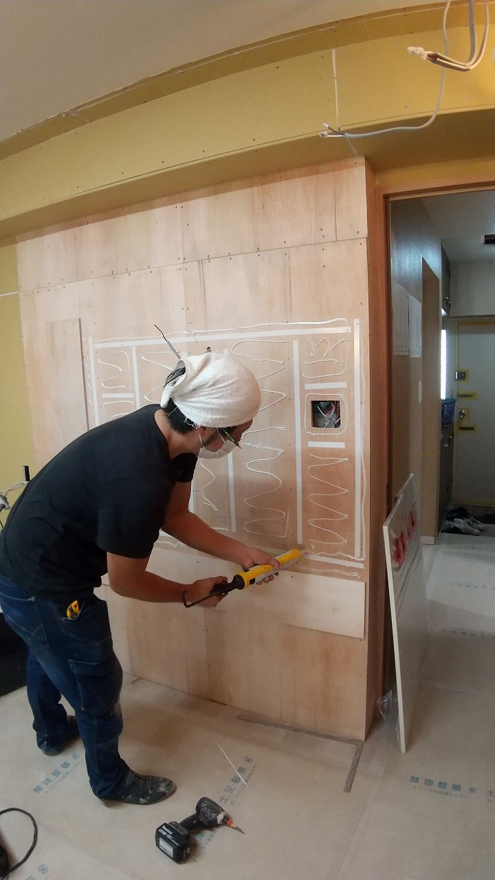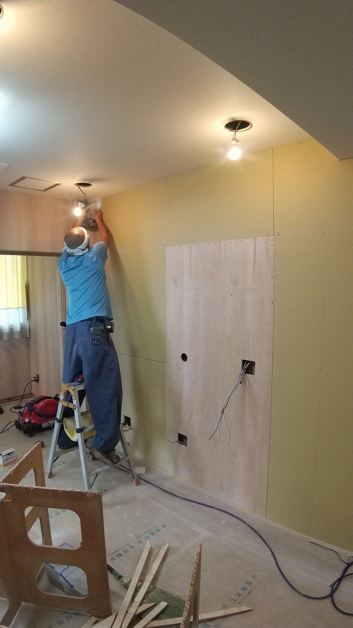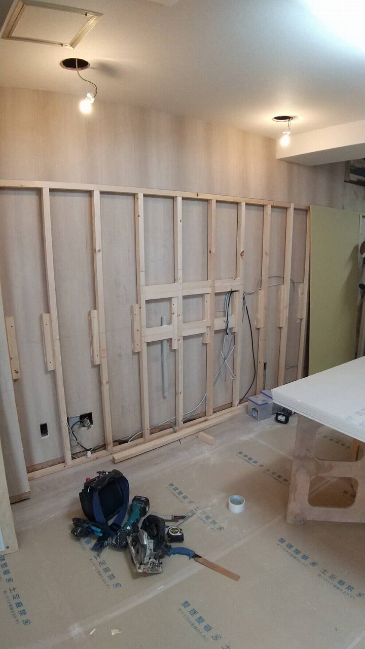 壁に壁掛けテレビを設置するので、壁を補強し、TVで配線が隠れる位置を開口して線を通しておきます。