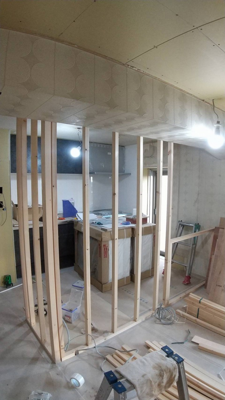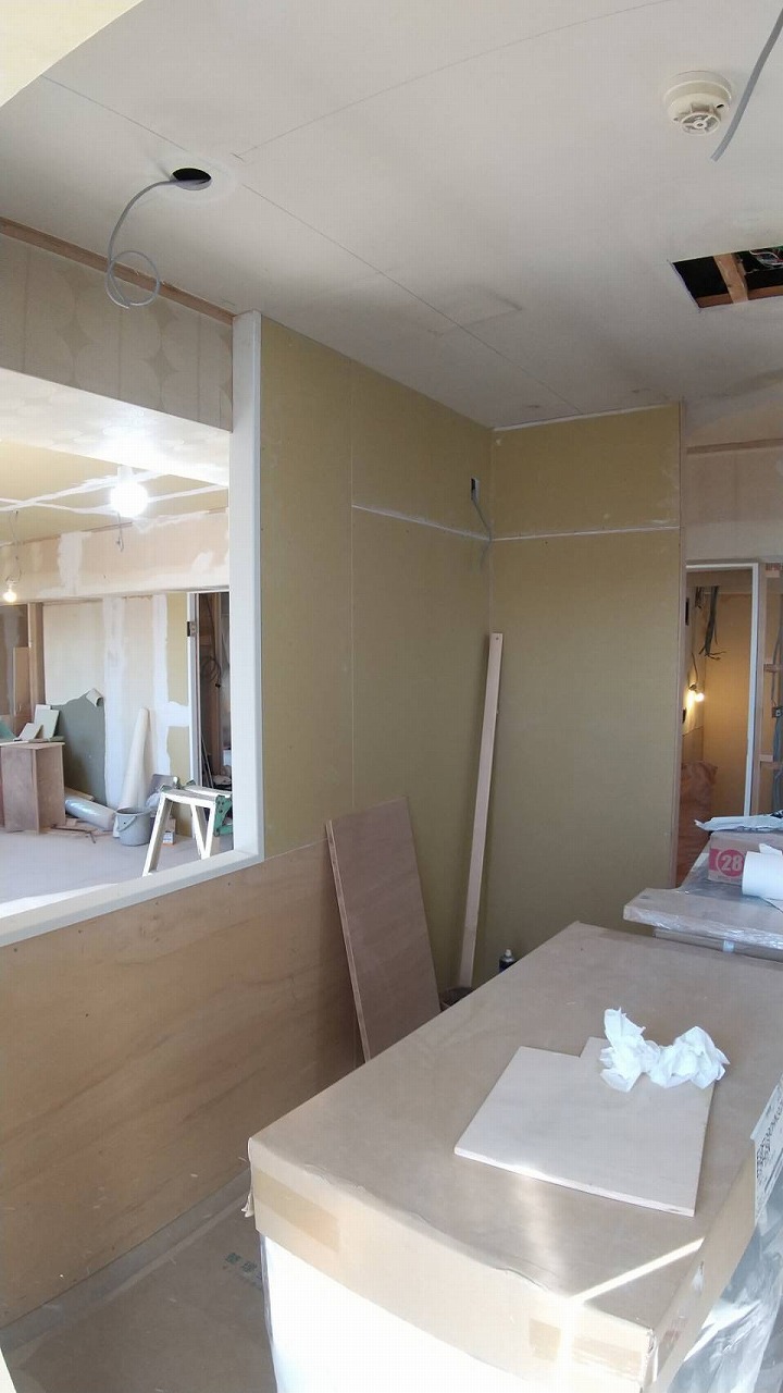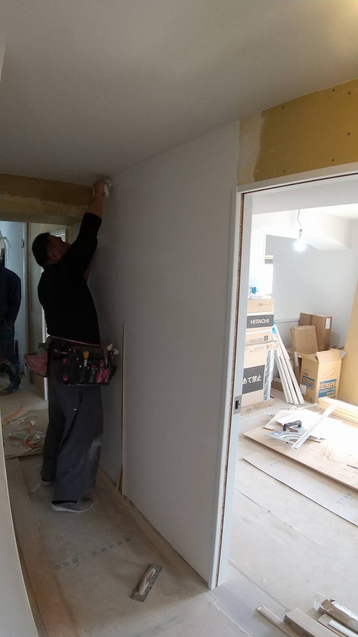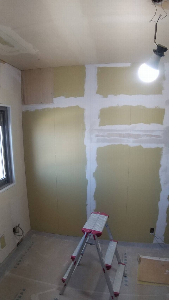 貼り終わったところから、養生をして、残りの造作壁を作っていきます。