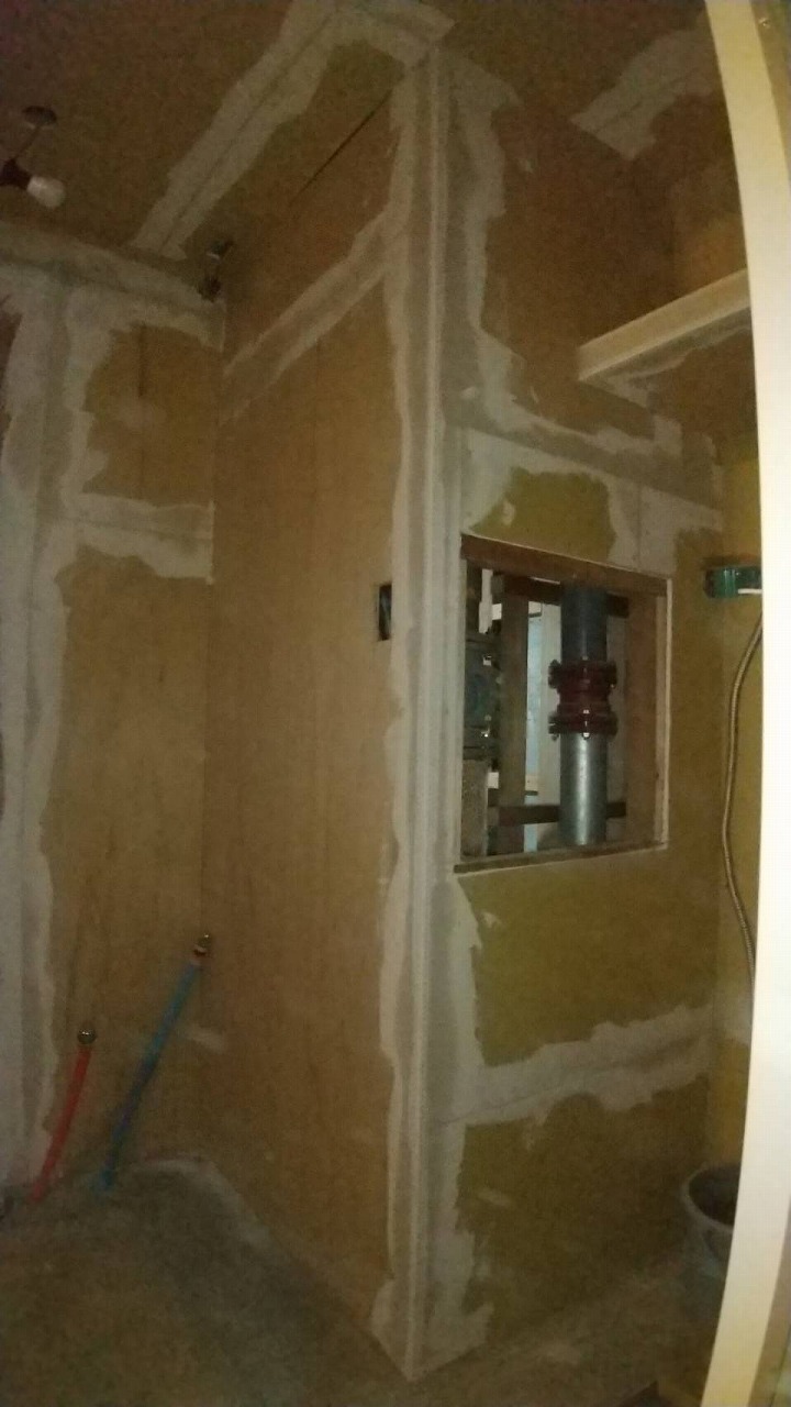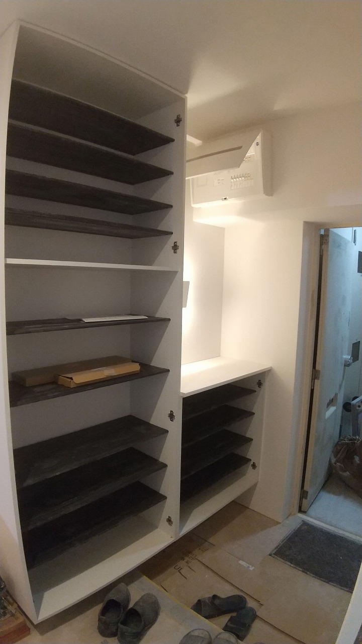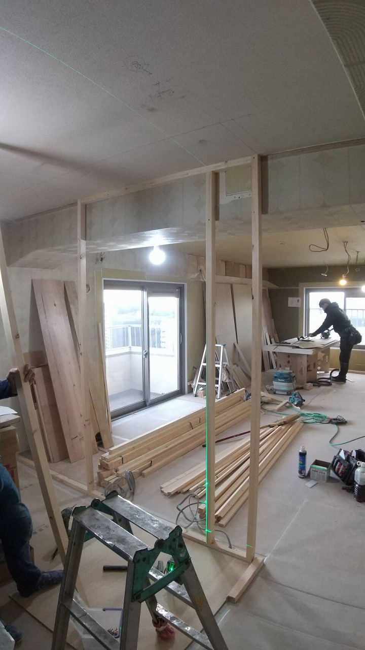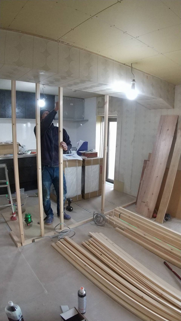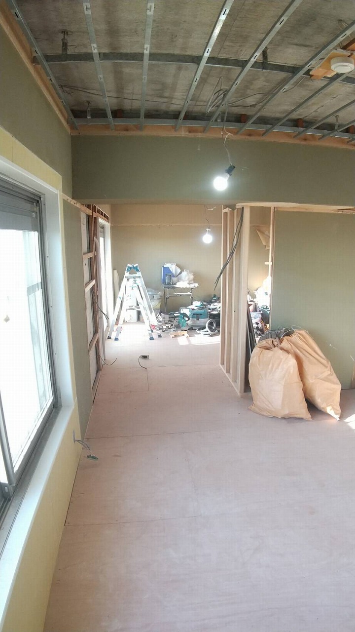 貼り終わったところから、養生をして、残りの造作壁を作っていきます。