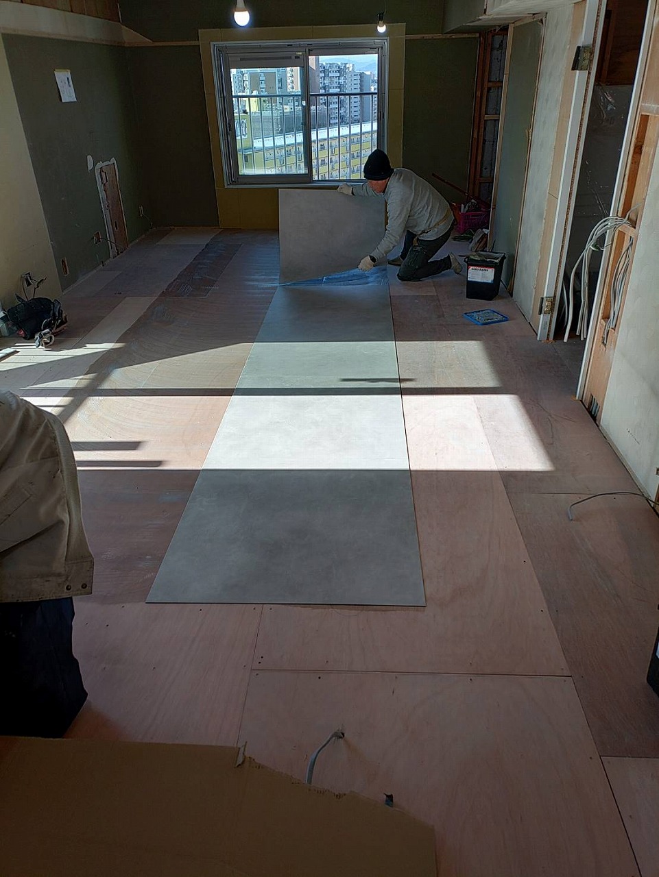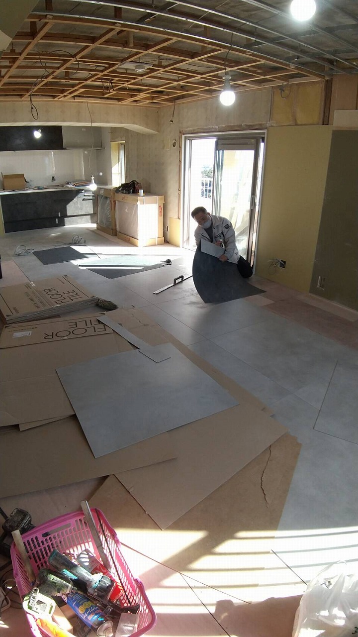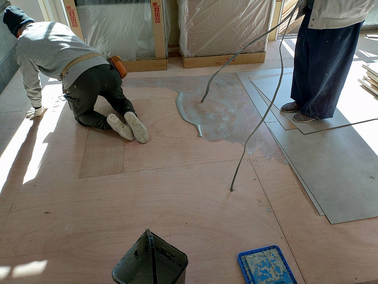 ベニアを貼った床に大判のフロアタイルを施工します。
