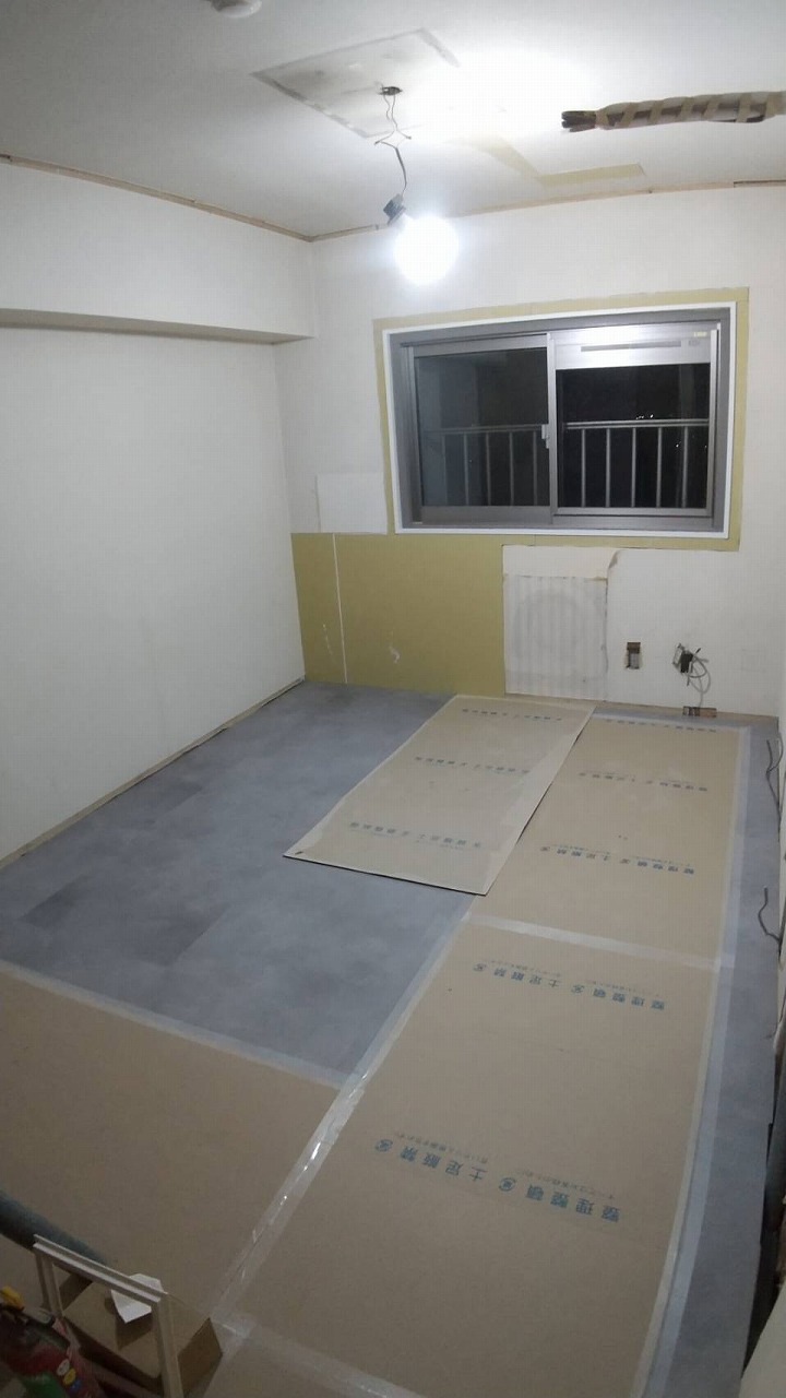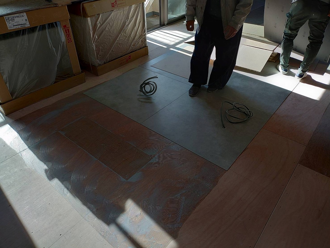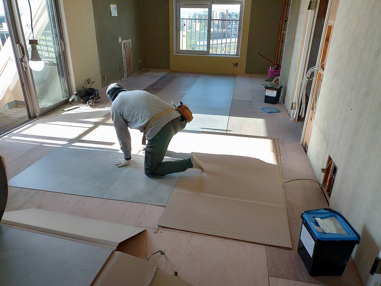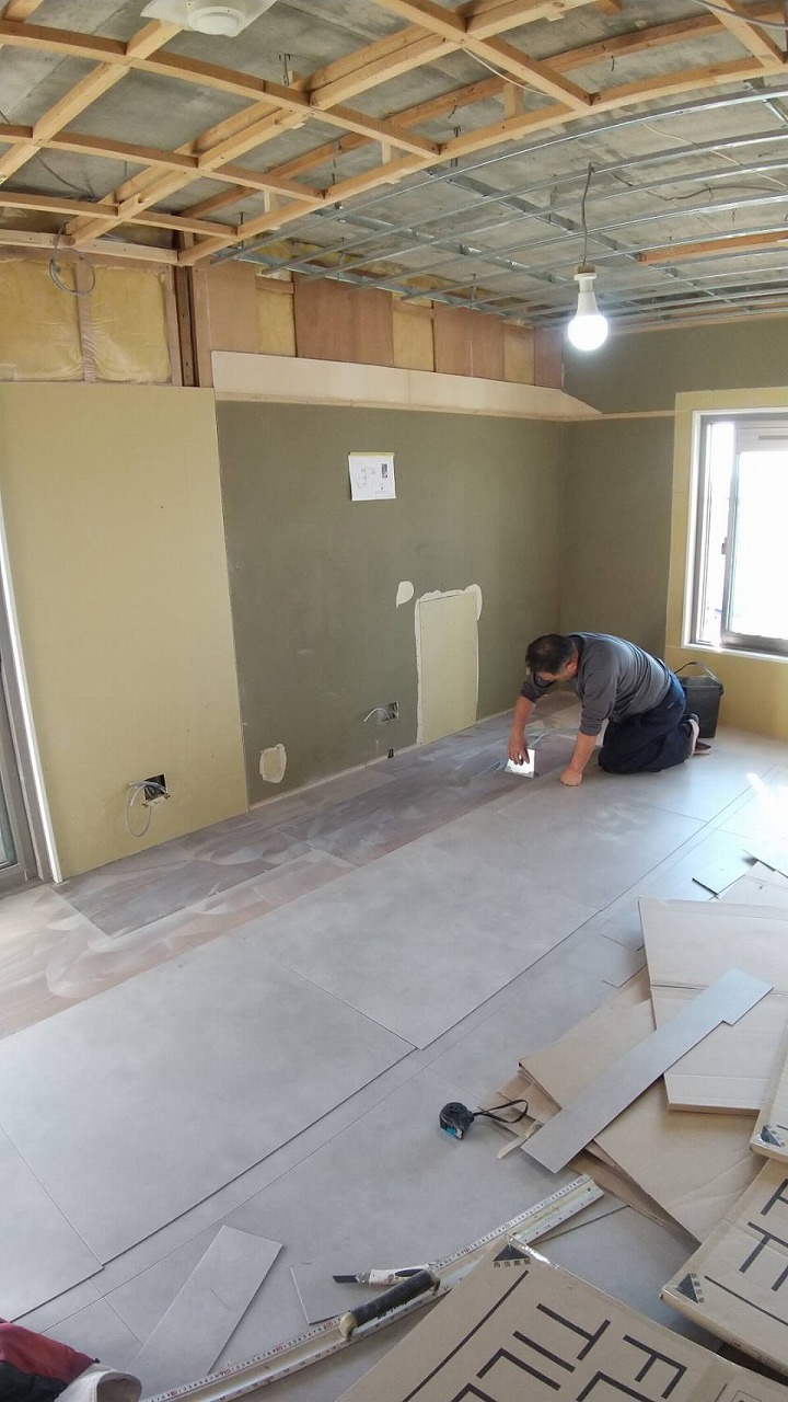 ベニアを貼った床に大判のフロアタイルを施工します。