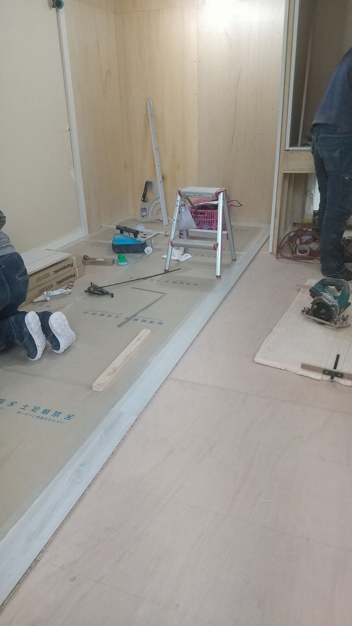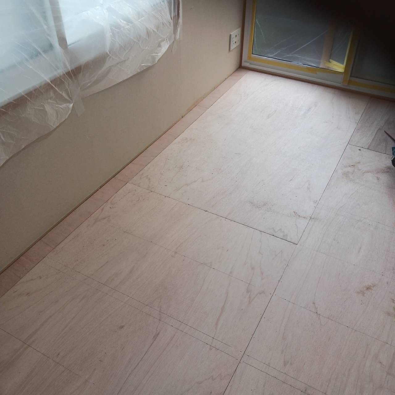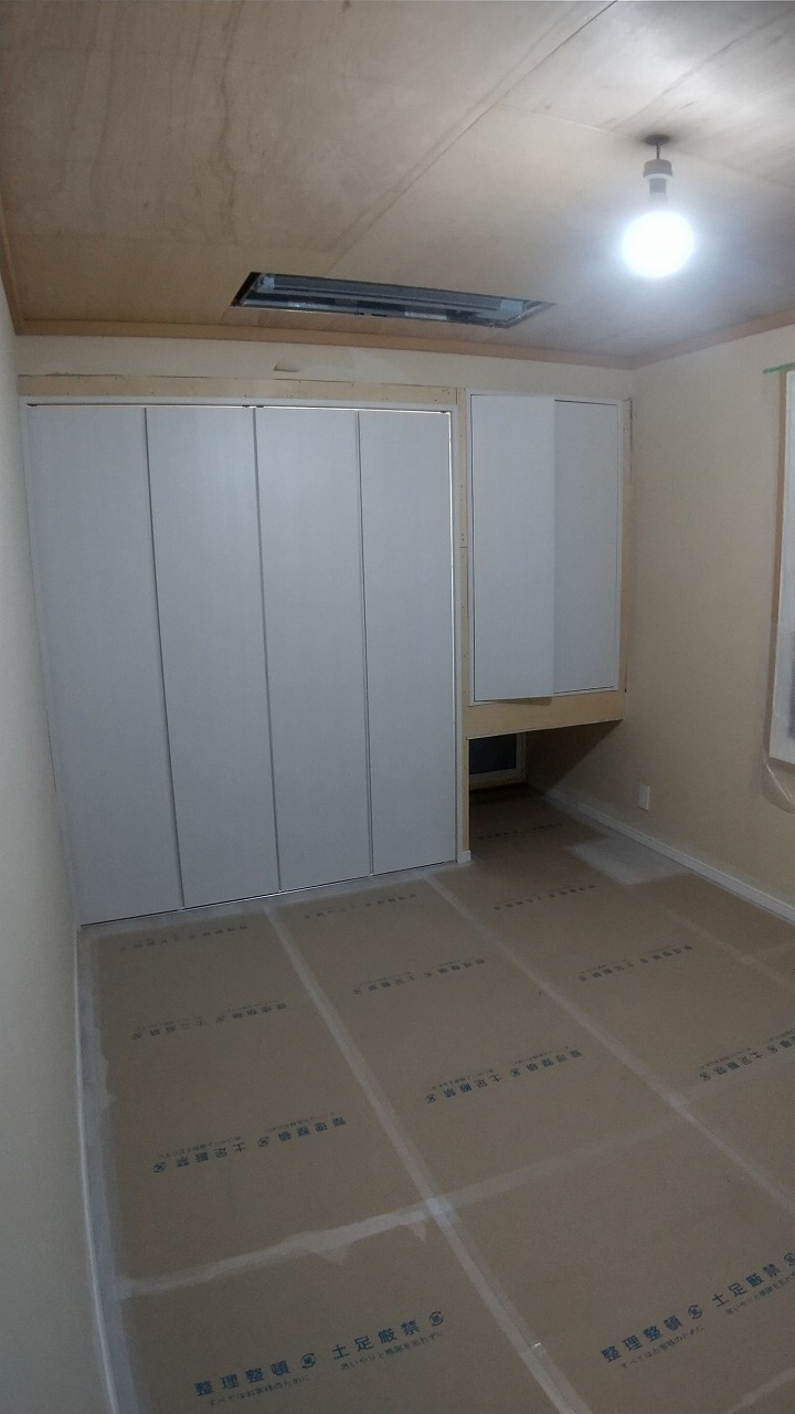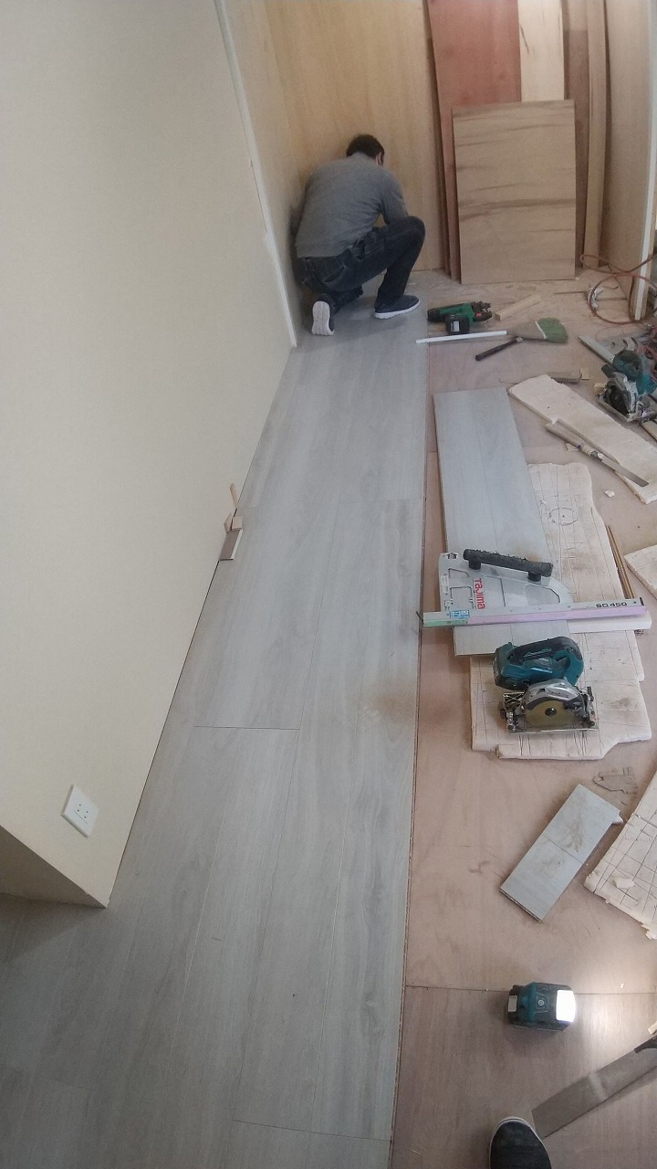 畳を撤去した床は、根太組みをし、捨てベニアを貼って、既存のお部屋の床と高さを合わせてフローリングを貼っていきます。貼った場所から養生です‼