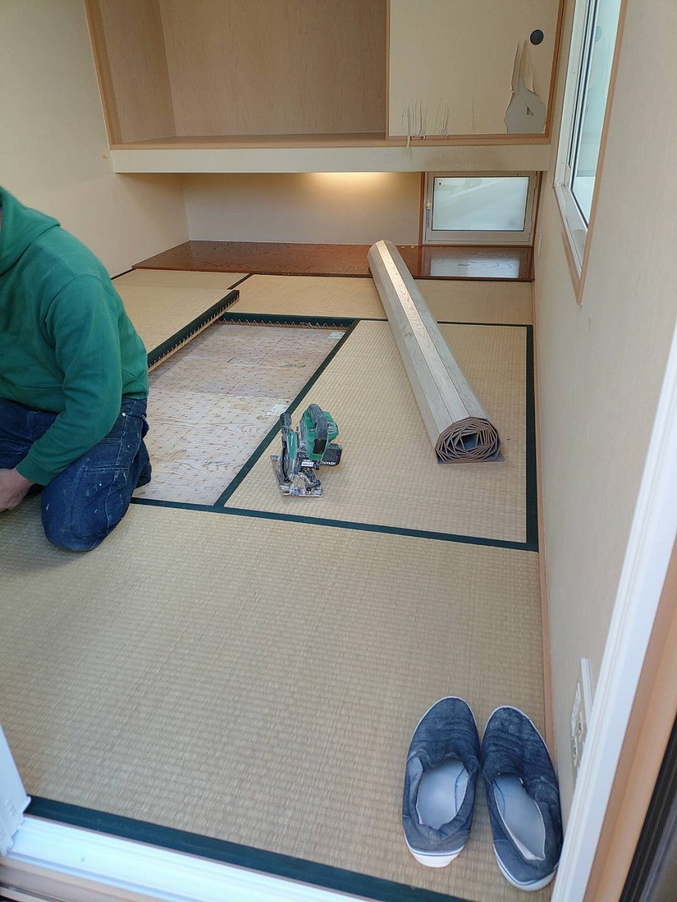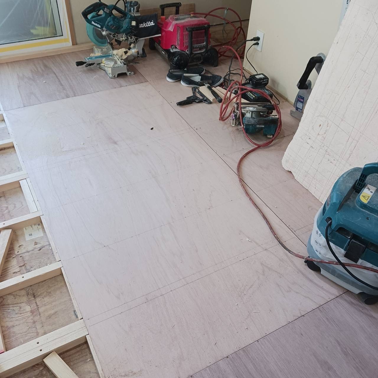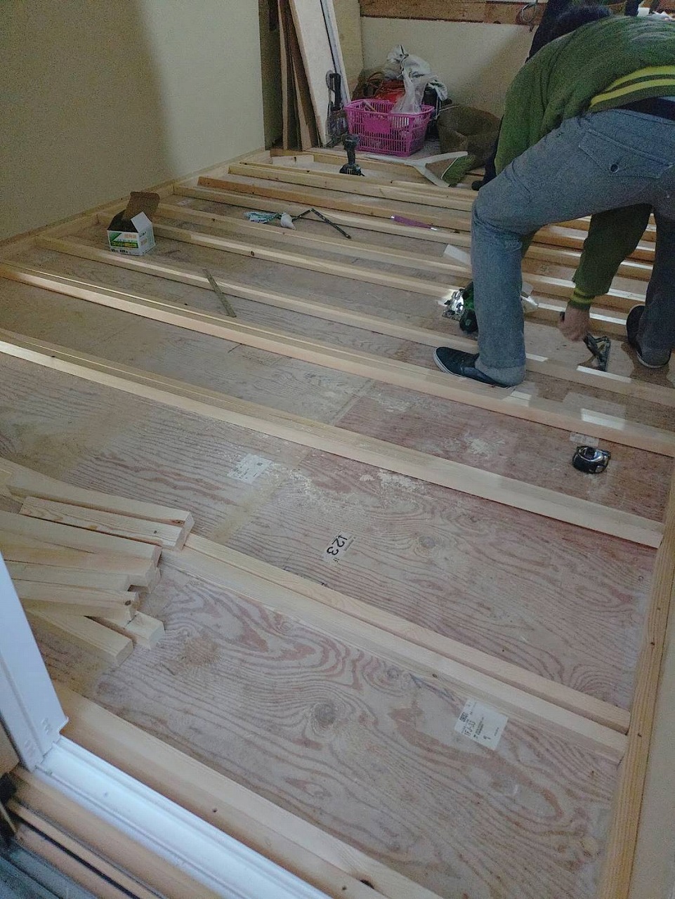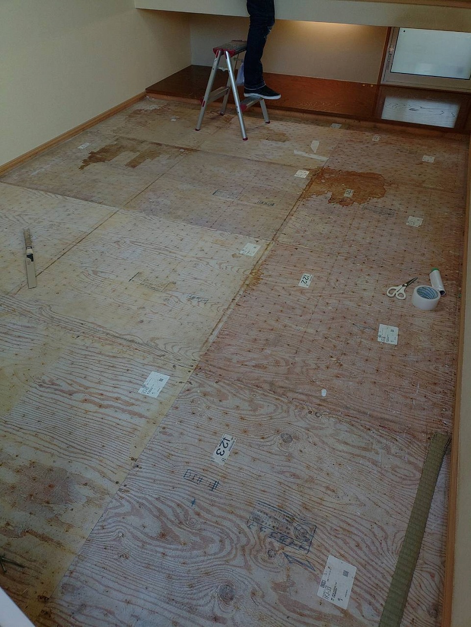 畳を撤去した床は、根太組みをし、捨てベニアを貼って、既存のお部屋の床と高さを合わせてフローリングを貼っていきます。貼った場所から養生です‼