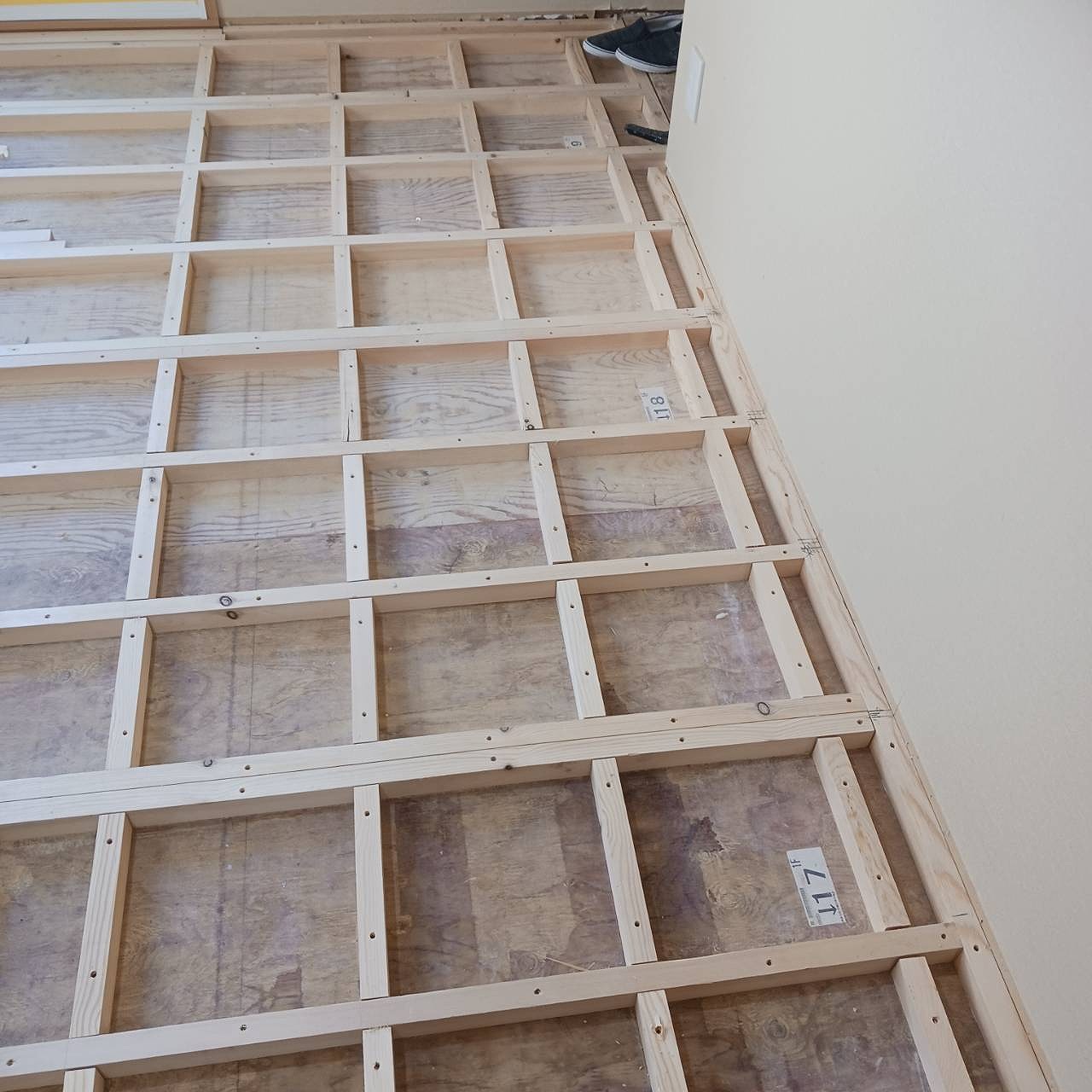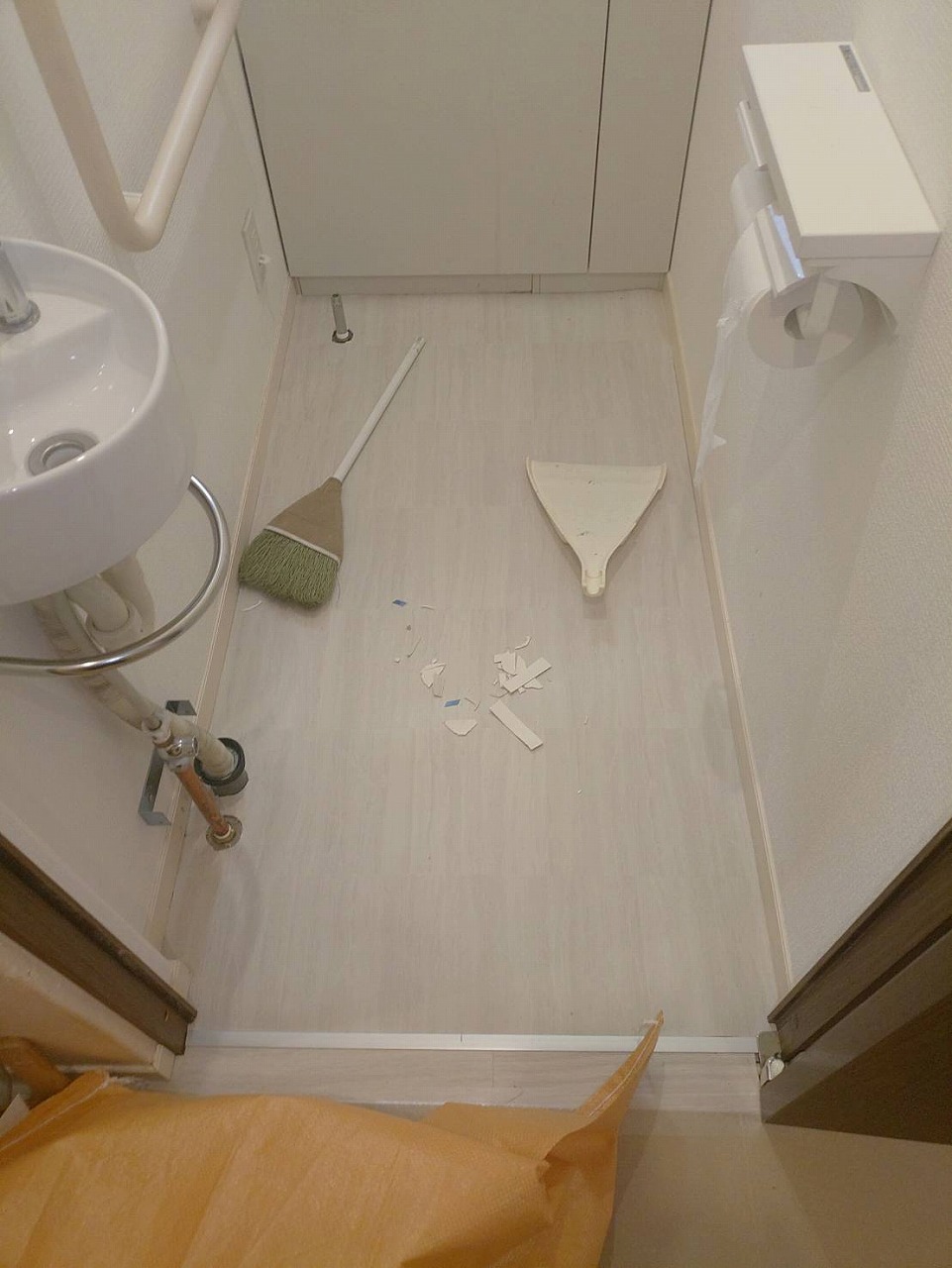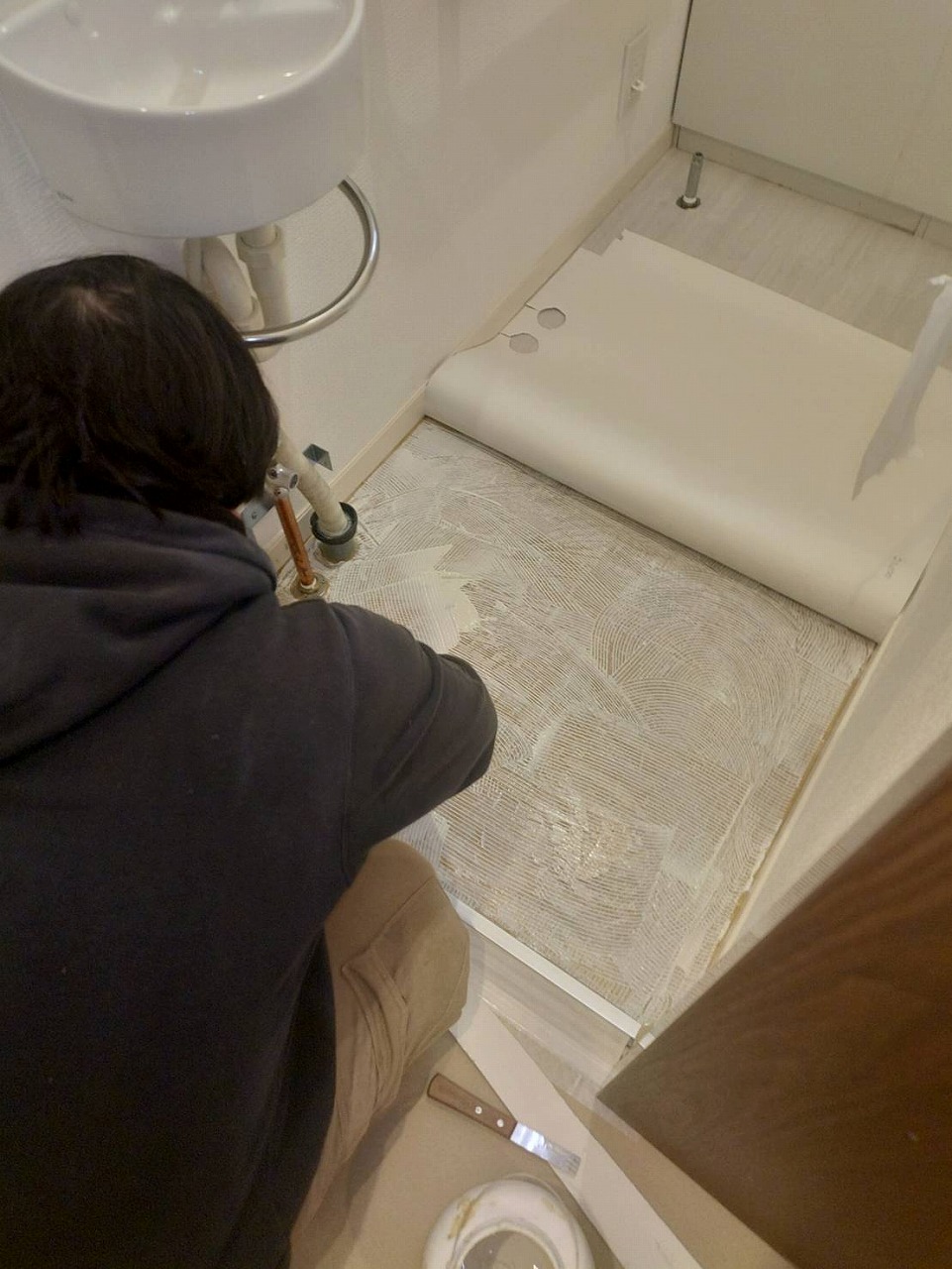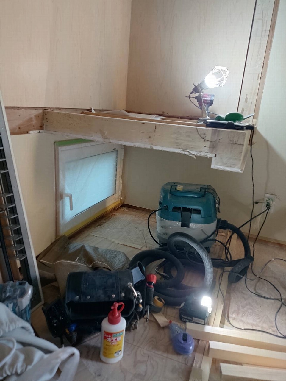 畳を撤去した床は、根太組みをし、捨てベニアを貼って、既存のお部屋の床と高さを合わせてフローリングを貼っていきます。貼った場所から養生です‼