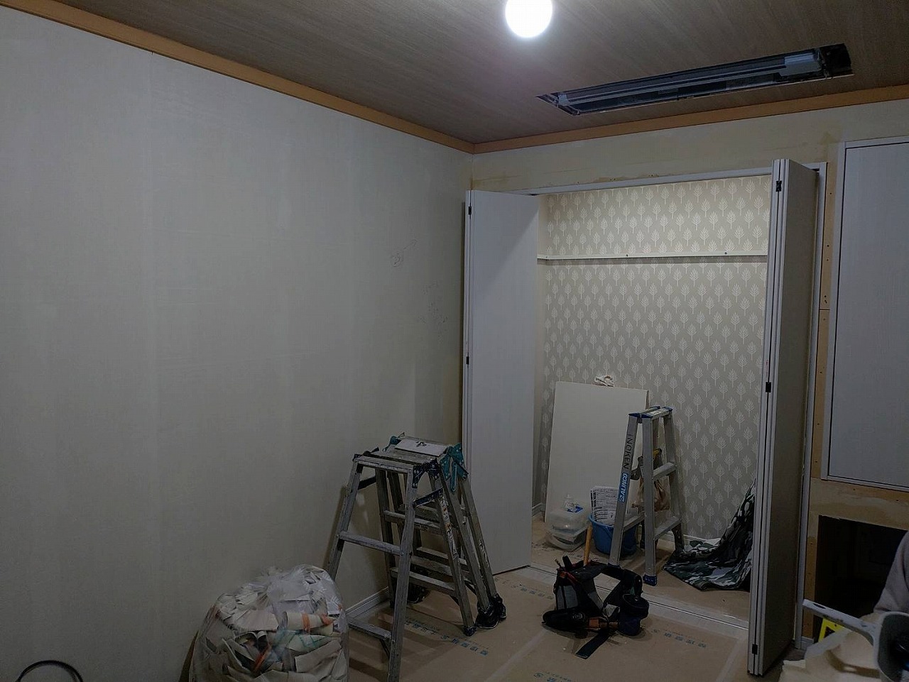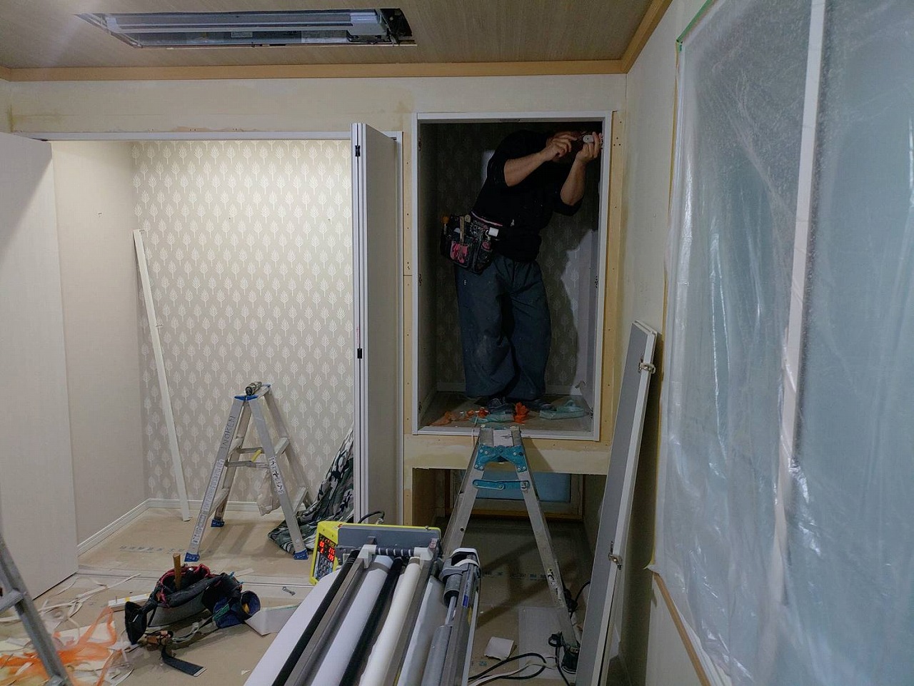 まずは、畳を撤去。押入については、右下に小窓があるため、右側は下を開口にした開き戸の収納に。左は、コートなどもかけられるように、枕棚+パンガーパイプの折れ戸の全開口収納に。