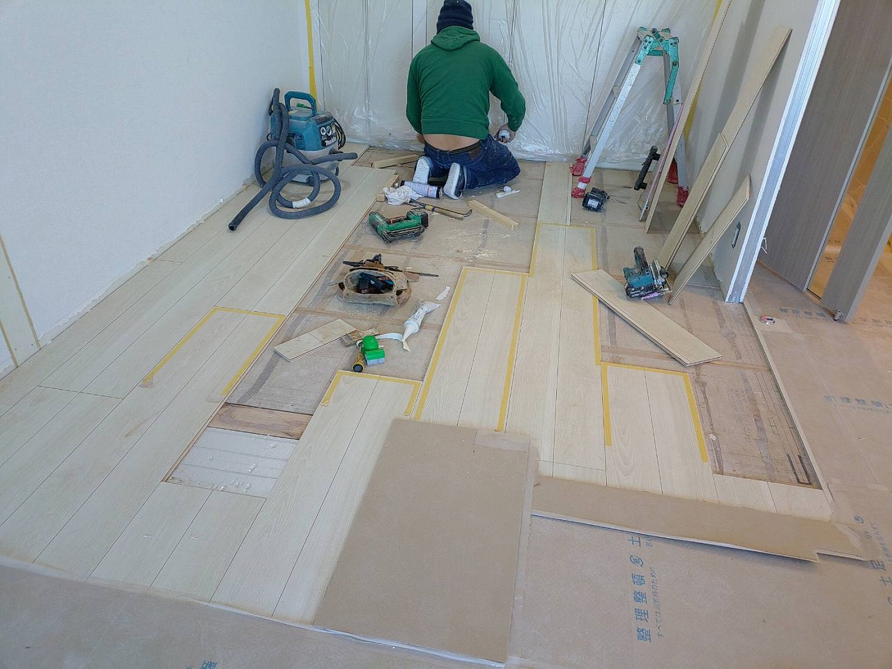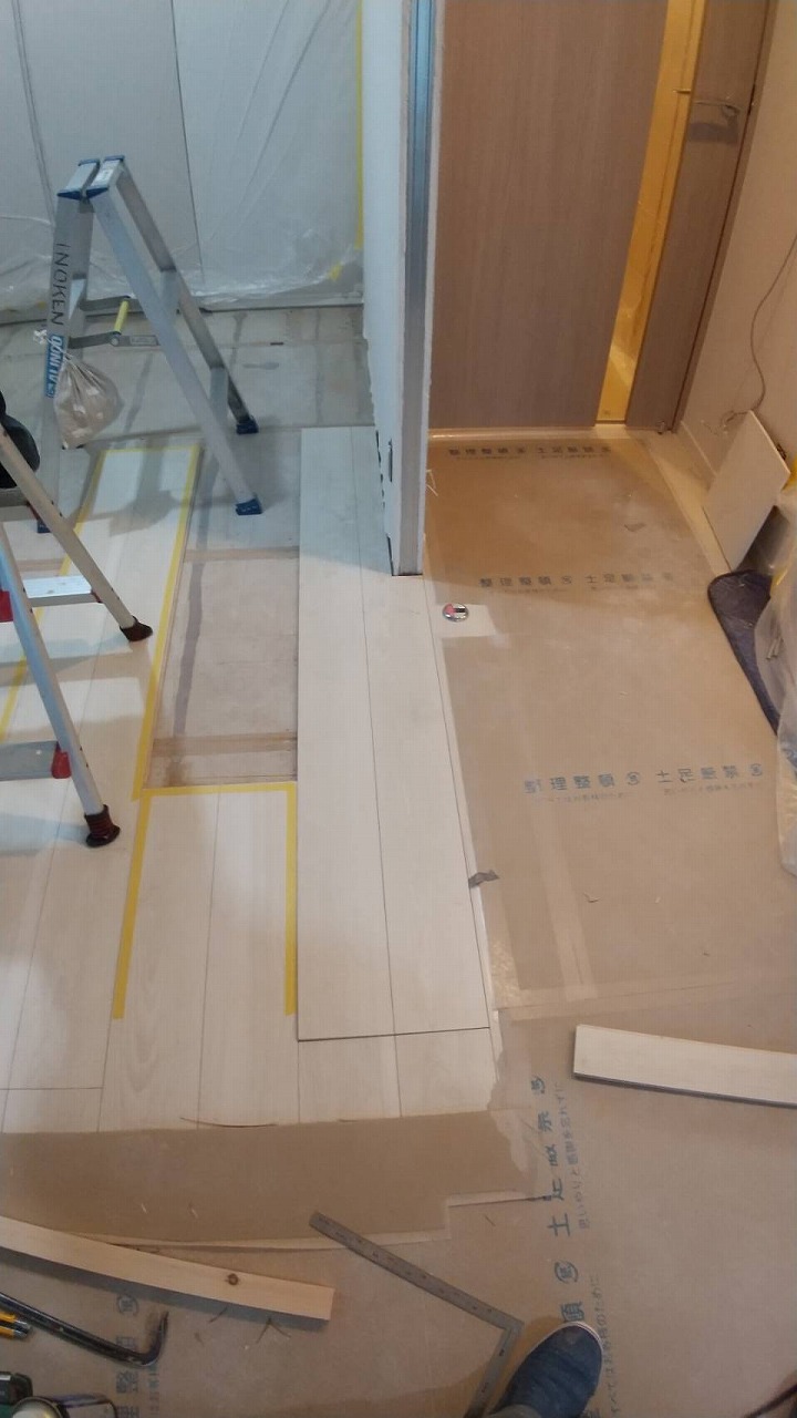 既存のフロアの実(サネ)に合わせて、はがした部分のフロアを貼っていきます。
