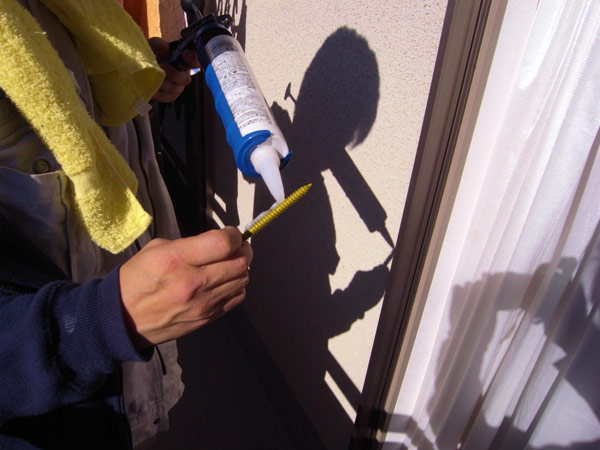 取付ビスに防水の為、シーリング材を注入します。