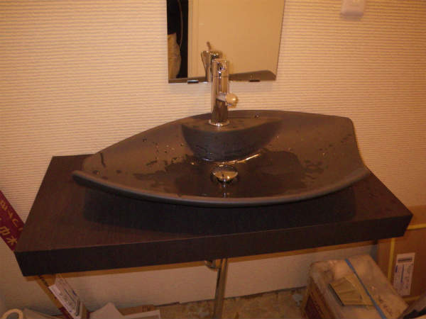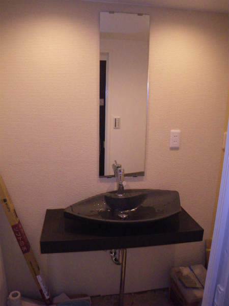 造作台にシートを貼って、洗面ボウルを取り付け、配管を接続し、鏡を設置して完成です。