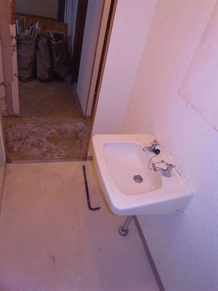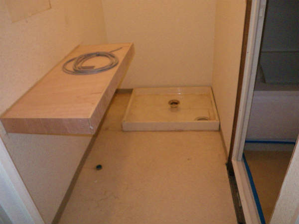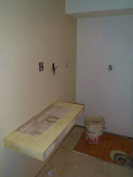 既存洗面器を撤去し、給水給湯排水管を切り廻し、洗面ボウルを乗せる台を造作し、