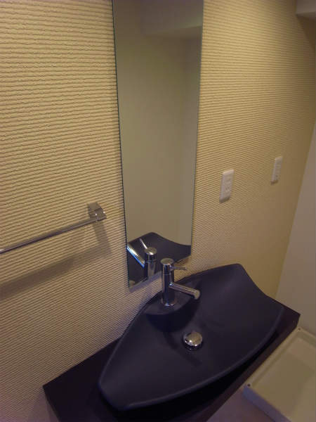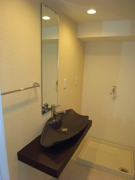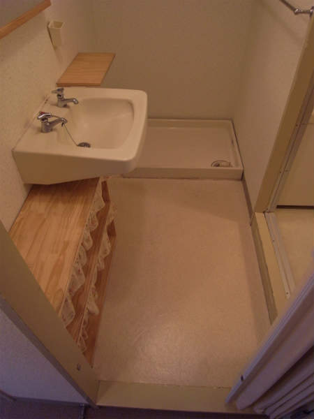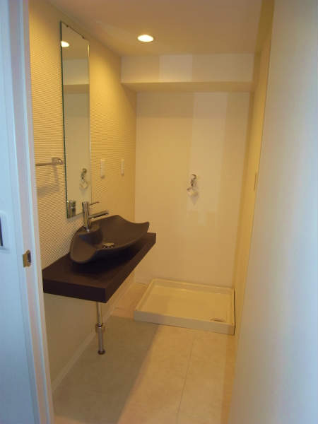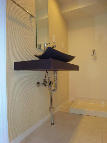 仕方ありません。通常の洗面化粧台を取り付けてしまうと、浴室の方まで出っ張ってしまいます。