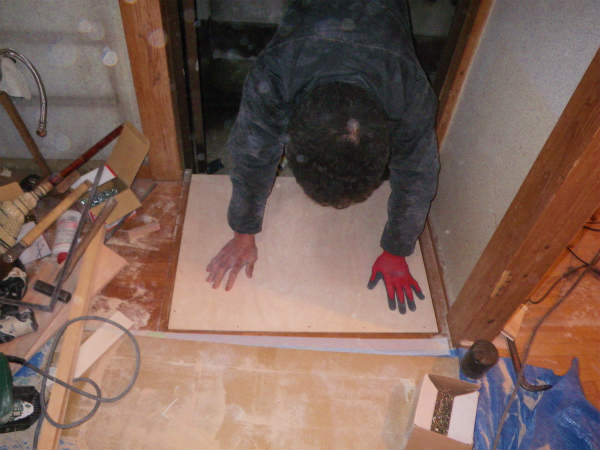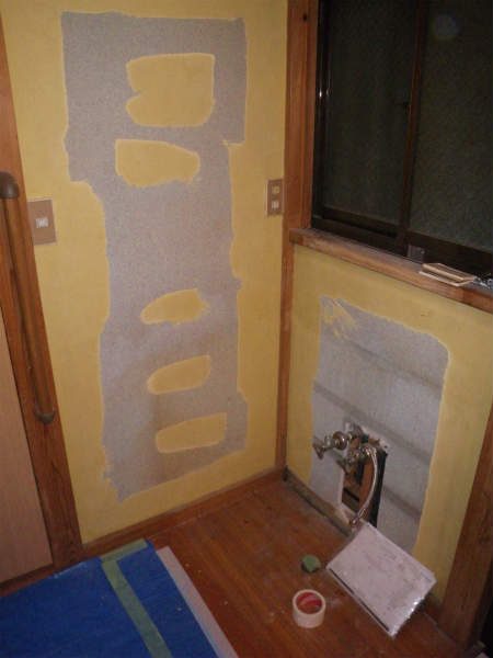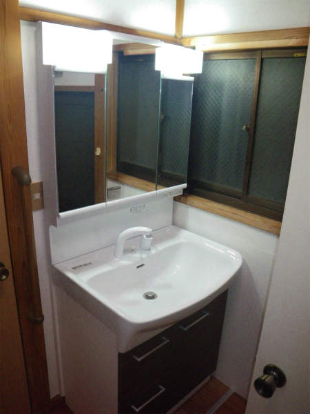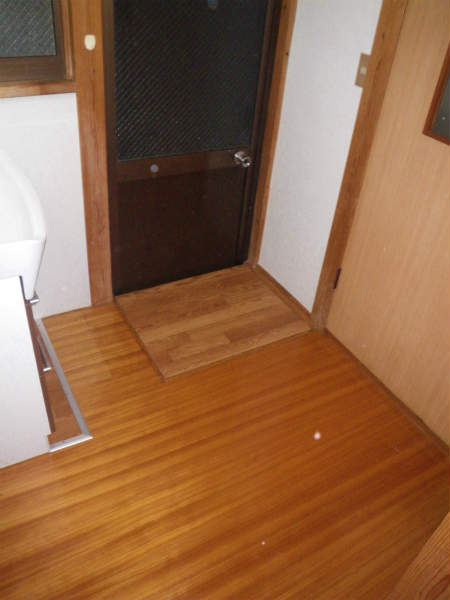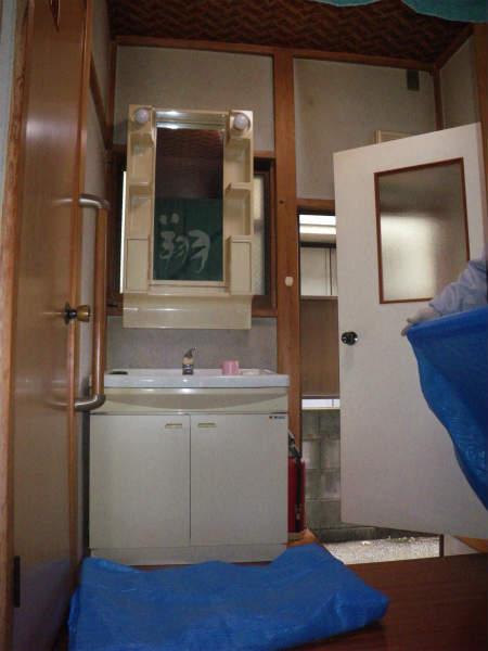 床にCFシートを張り、クロスを張り替えて、洗面化粧台を設置します。