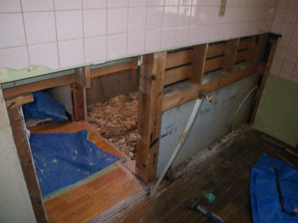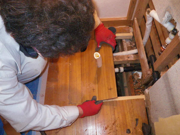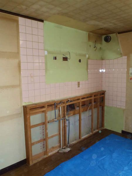 既存キッチンを解体して、新しくするシステムキッチン用に給水管、給湯管、排水管を切り廻します。