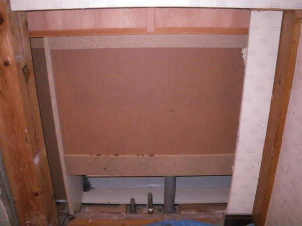 既存の洗面化粧台を解体撤去し、給水・給湯・排水管を切り廻し、