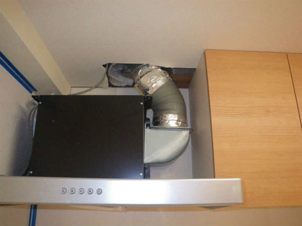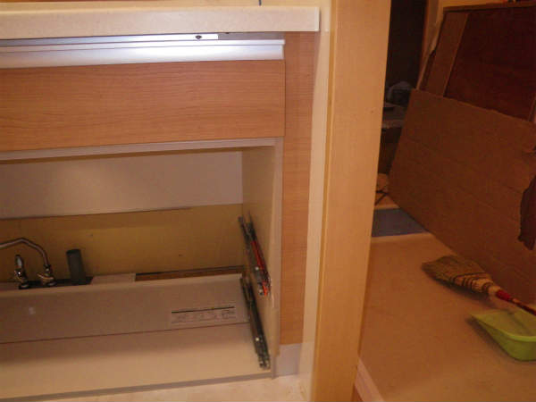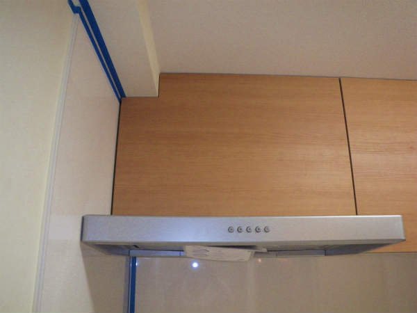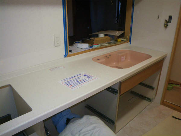 キッチンパネル、レンジフード、吊戸、シンク台、天板…と順番に取り付けていきます。