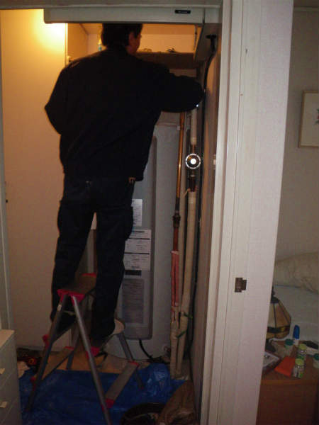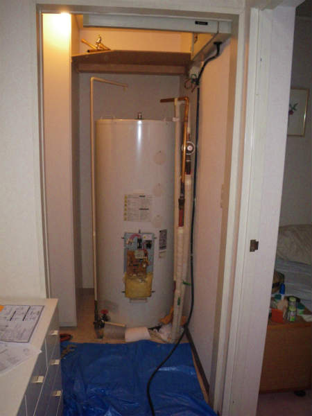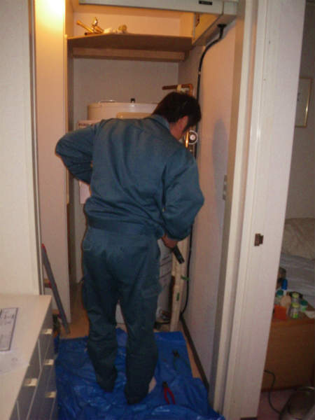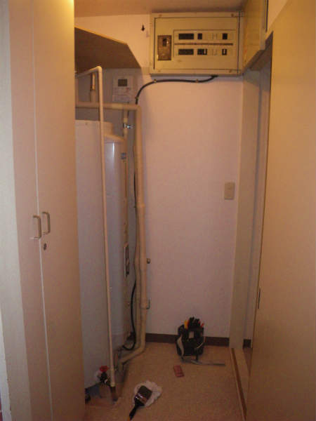 撤去し、新しい温水器を入れ替えるのと同時に現在の電力の供給はどなっているか調べます。