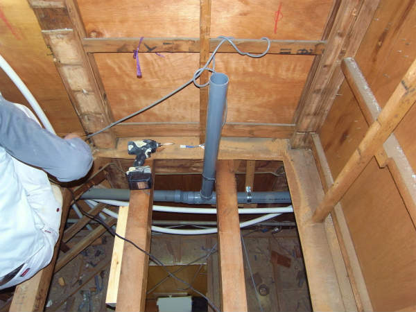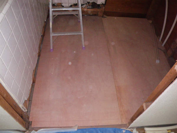 配管を切り廻したあと、ユニットバスが入るように、床下地を造作します。