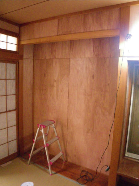 繊維壁(じゅらく壁)にすべてベニア下地を貼りました。