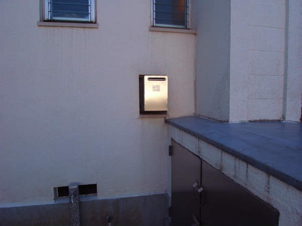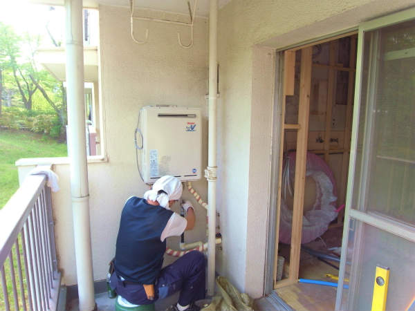 そこで、INOKENは、管理組合様の許可を取り、ベランダの外に「壁掛形の給湯器」を取り付け、