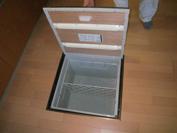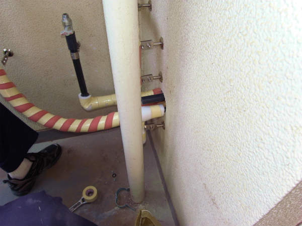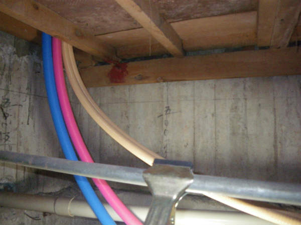 こうして給湯器から持ってきた、給湯管を床下に潜らせます。