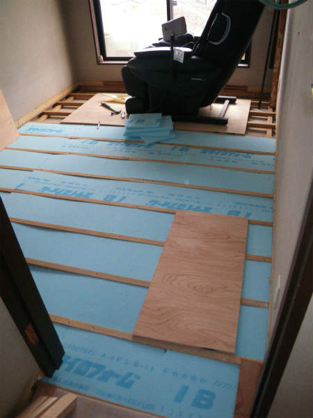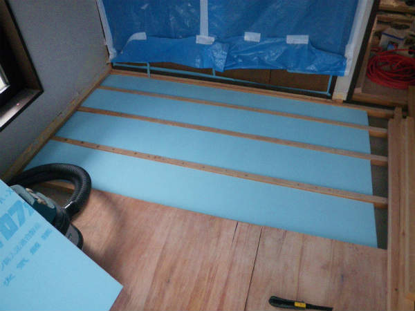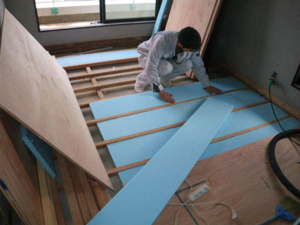 次に、床暖の効果を上げるために、床に断熱材を敷き詰めます。