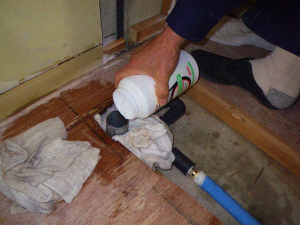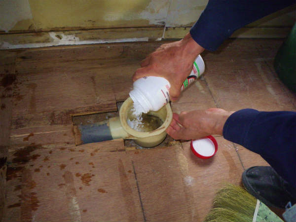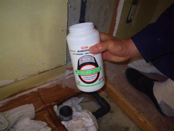 洗濯防水パンだけではなく、洗面化粧台の排水口にも薬剤を投入します。