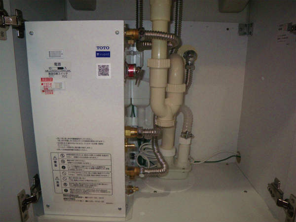 今回は、洗面化粧台の下台収納に小型電気温水器『湯ぽっと』を設置します。