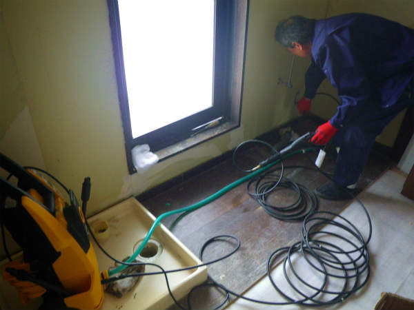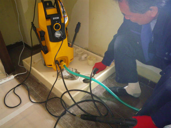 高圧洗浄を一旦かけた後、洗濯防水パンを取外し、業務用の洗浄薬剤を投入します。