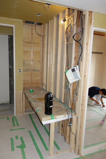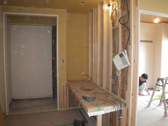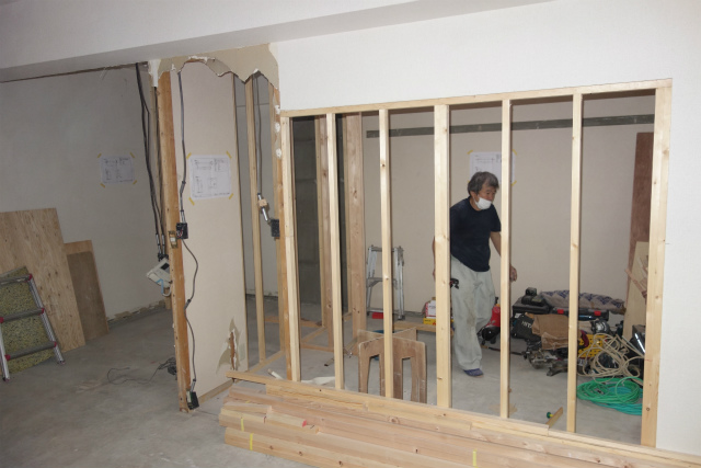 フルリフォーム 内装リノベーション工事④ 横浜 マンション 2016/07/12 本日は、壁の下地造作に入ります。 和室から洋室に変更するための壁下地造作は完了しました。 次に、書斎部分の壁造作をします。 リビングの一角にパソコンルーム(書斎)を作りたいとのご希望がありましたので そのようにお部屋の間取りを変更しました。 フローリングも完了し、クロスを貼ります。 クロスはティファニーブルーをアクセントクロスで貼りました。 それでは、完成です。 と本日はここまで。 次回をお楽しみに‼