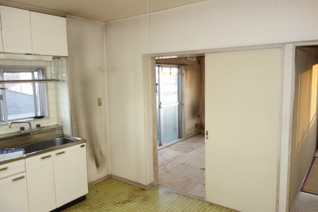 DSC00219 玄関上がってリビングに入るところです。建具ドアもかなり傷んでいました。