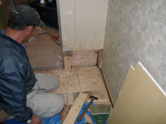 脱衣所のドア付近の壁に部分的にクロスを貼って完了です。