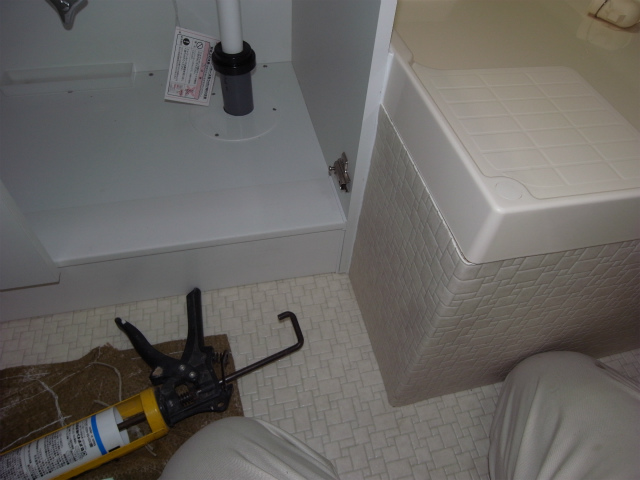 仕上げに床CFシートを貼りかえて、取り合いにコーキングをします。