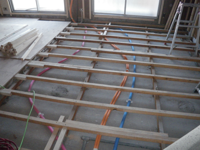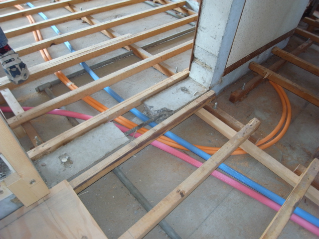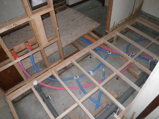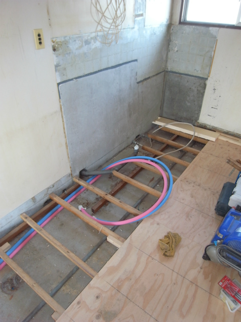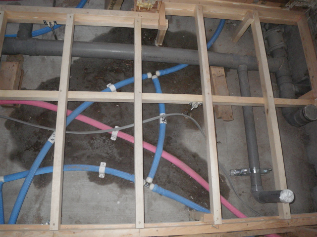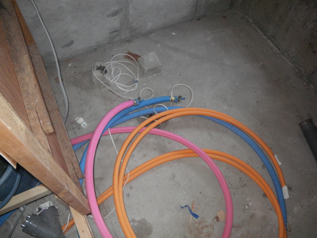 きれいにピンク色のお湯(給湯管)、青色のお水(給水管)、オレンジ色の追炊き(往き戻り管)の配管切り廻しは完了しました。