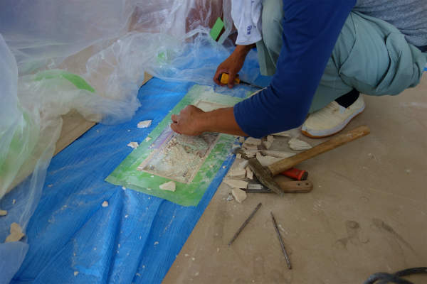 撤去が終わって、大理石を加工し、接着剤を塗りなおして、貼り付けます。