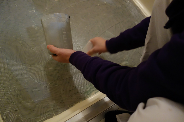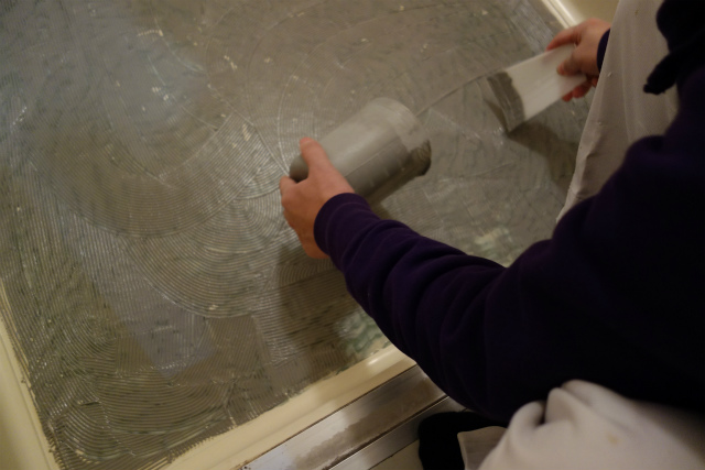 パテが乾いたので、バスナフローレを貼るために接着剤を塗布します。