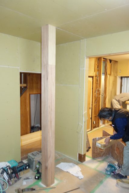 天井に野縁下地を組み、壁は和室の真壁から王壁に変更するために下地を組み