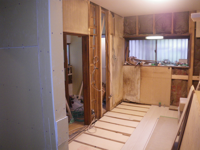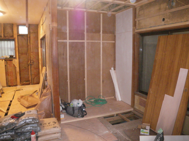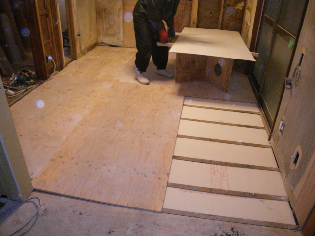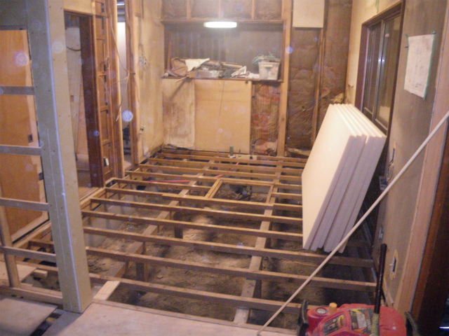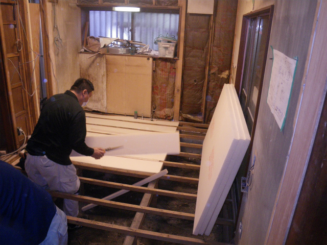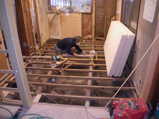 床には断熱材を入れて、根太を組み替えて下地べニアを貼りました。