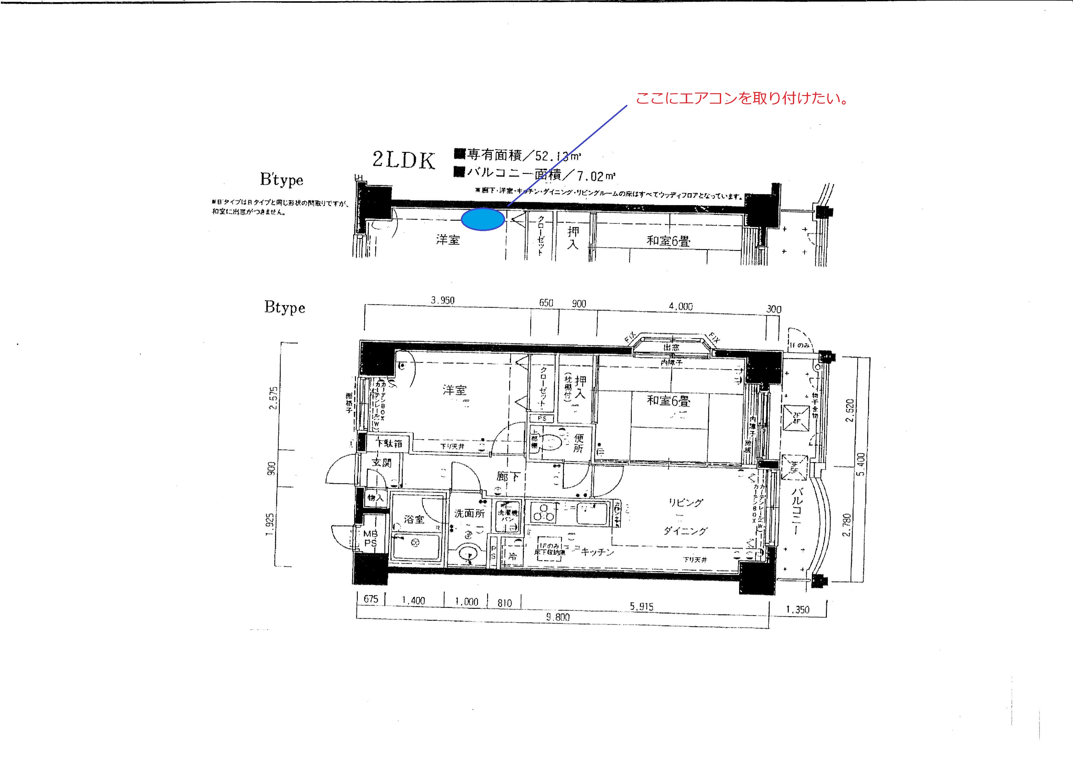 こちらのマンションを購入されたお客様より北側の洋室にエアコンを取り付けたいんだけども